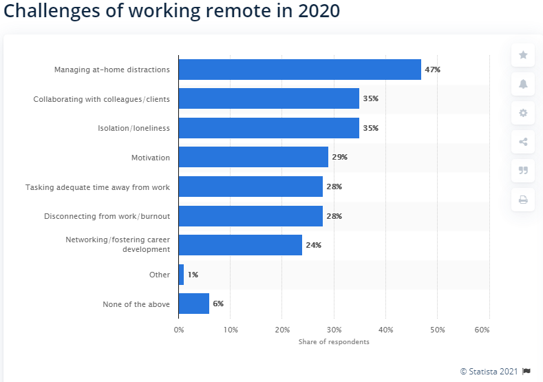 Wystarczy spojrzeć na te dane dzięki uprzejmości Statista. Prawie połowa (47%) respondentów wskazała „rozproszenie uwagi w domu” jako główną przeszkodę w pracy zdalnej. Nie wspominając o 29% osób, którym brakuje motywacji podczas pracy w domu.