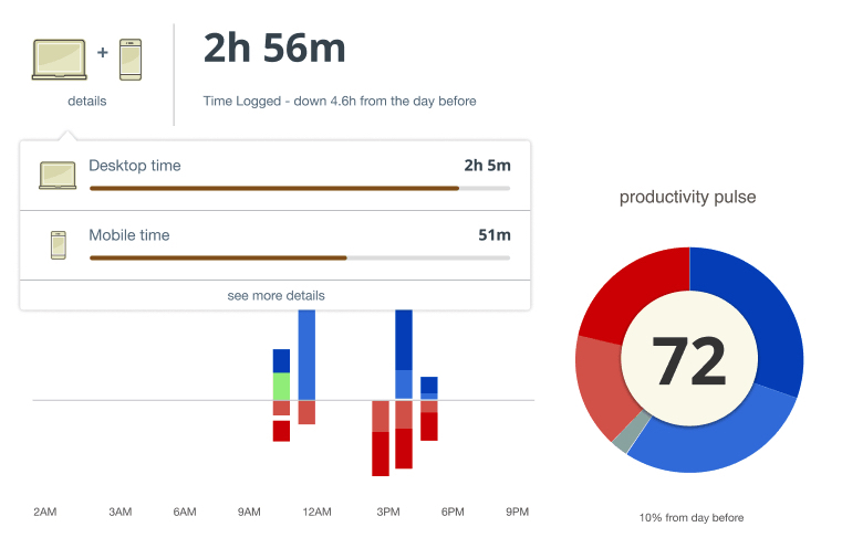 Po zebraniu wystarczającej ilości danych RescueTime zaczyna generować raporty zawierające pełny podział na to, jak (i gdzie) spędzasz czas, dając w ten sposób pomysły na optymalizację codziennego harmonogramu.