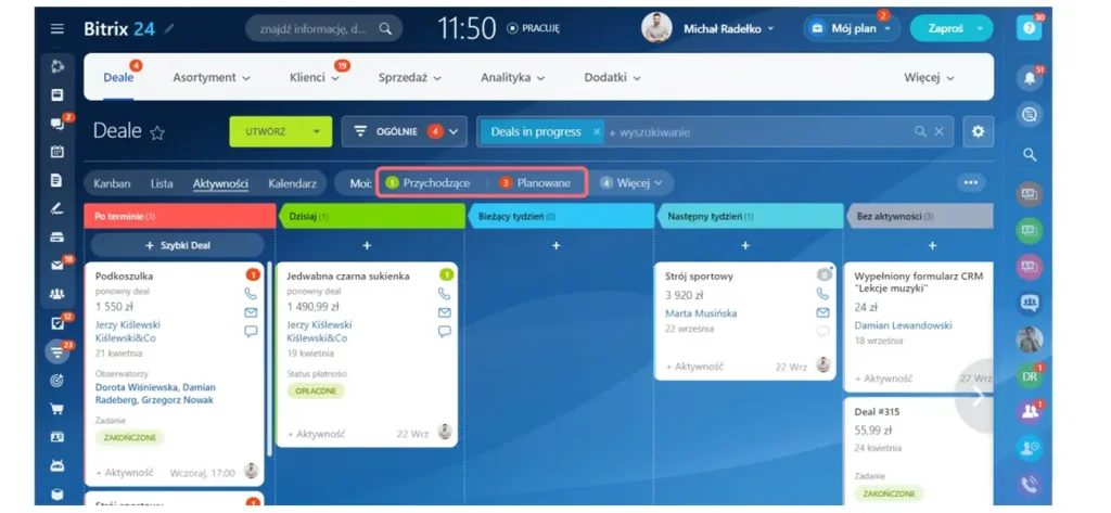 Bitrix24 oferuje szeroki wachlarz funkcji. Rdzeniem platformy jest moduł CRM, umożliwiający efektywne zarządzanie firmą, w tym zarządzanie kontaktami, leadami i dealami. Wizualny lejek sprzedaży ułatwia śledzenie postępów. Platforma wspiera wielokanałową komunikację z klientami poprzez formularze CRM, widget czatu, integracje z komunikatorami (WhatsApp, Instagram, Facebook Messenger), wbudowaną telefonię VoIP oraz e-mail. Dostępne są narzędzia wspierające sprzedaż, takie jak tworzenie ofert i faktur, zarządzanie płatnościami czy obsługa podpisów elektronicznych (e-Podpis).