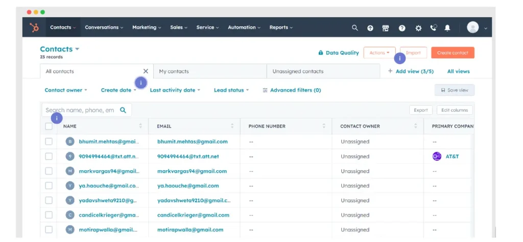 HubSpot oferuje bogaty zestaw funkcji i wiele z nich dostępnych jest już w darmowej wersji. Podstawą platformy jest darmowy CRM, który obejmuje zarządzanie kontaktami, firmami, transakcjami (wizualny lejek sprzedaży – deal pipeline) oraz zadaniami. Umożliwia również śledzenie aktywności kontaktów na stronie internetowej oraz dostarcza podstawowych informacji o firmach.