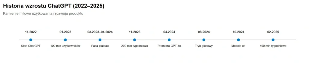 W ostatnich miesiącach zaobserwowaliśmy jednak powrót do dynamicznego rozwoju. Wzrost ze 100 milionów do 200 milionów tygodniowo aktywnych użytkowników zajął ChatGPT dziewięć miesięcy (od listopada 2023 do sierpnia 2024). Zazwyczaj ekspansja na tak dużą skalę staje się trudniejsza, ale w tym przypadku podwojenie liczby użytkowników – osiągnięcie 400 milionów tygodniowo aktywnych użytkowników – zajęło mniej niż sześć miesięcy, do połowy lutego 2025 roku.