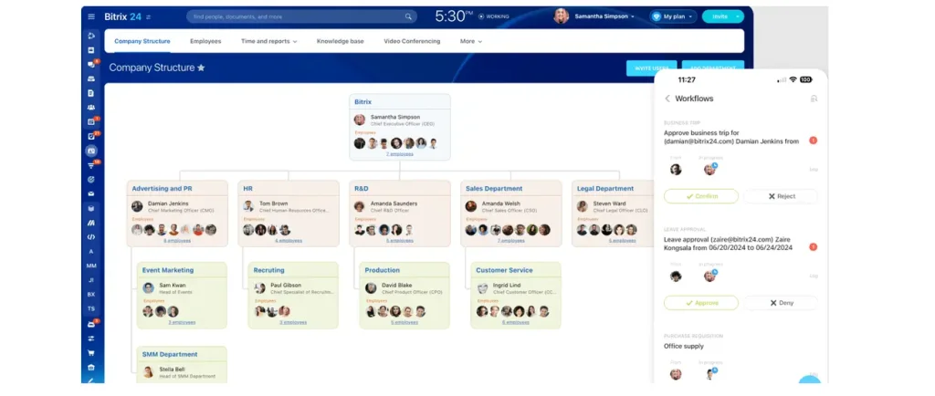Bitrix24 podchodzi do onboardingu jako do integralnej części szerszych procesów HR i zarządzania pracą, a nie jako do izolowanej funkcji. Platforma wykorzystuje swoje wbudowane narzędzia do zarządzania zadaniami, automatyzacji przepływów pracy, komunikacji wewnętrznej oraz moduł HRMS do stworzenia ustrukturyzowanego, ale elastycznego procesu wdrażania nowych pracowników. Siłą Bitrix24 jest możliwość centralizacji wielu aspektów onboardingu w jednym miejscu.