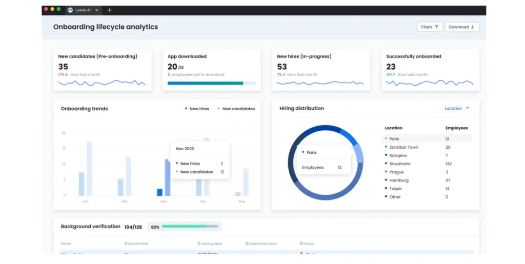 Onboarding w Leena AI jest w dużej mierze zarządzany przez inteligentnego chatbota. Nowy pracownik może komunikować się z botem (dostępnym np. w Slacku, Teams czy przez dedykowaną aplikację), aby zadawać pytania, otrzymywać informacje, wypełniać formularze i być prowadzonym przez poszczególne etapy procesu wdrożenia. Bot może proaktywnie wysyłać przypomnienia, przydzielać zadania (np. ukończenie szkolenia), zbierać dokumenty i feedback. Platforma integruje się z systemami HRIS/HCM w celu synchronizacji danych i automatyzacji przepływów pracy.