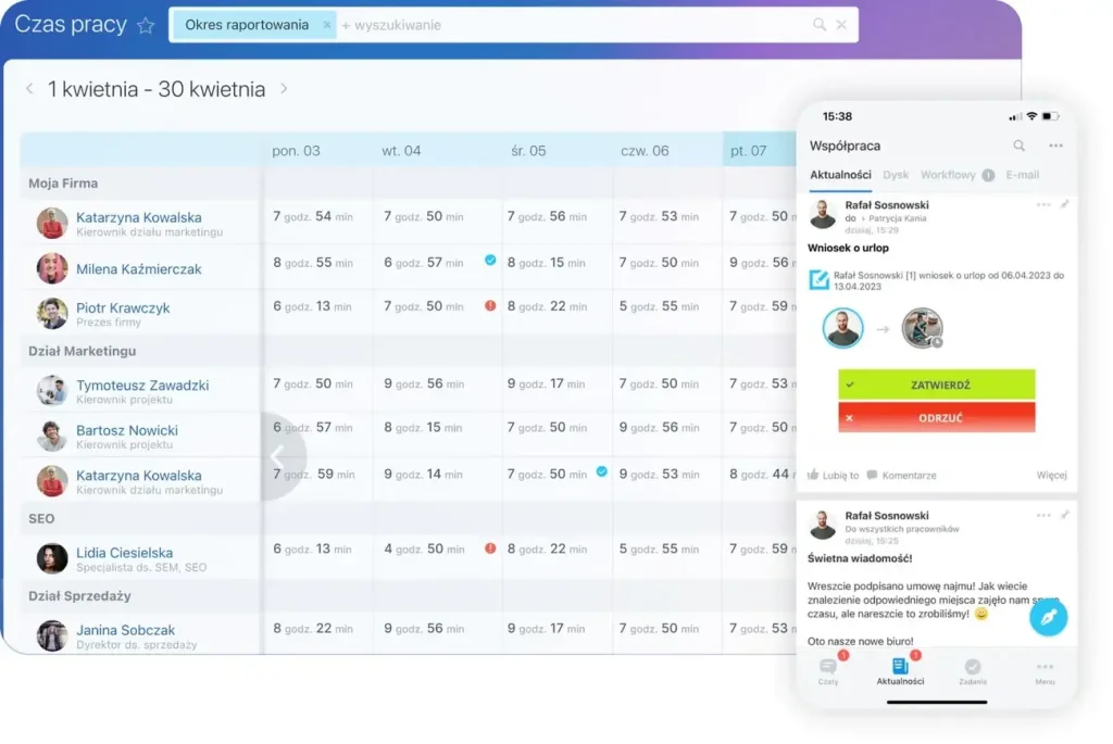 Ewidencja obecności: automatyczne monitorowanie obecności pracowników, co pozwala na szybkie wykrywanie nieobecności i generowanie raportów.