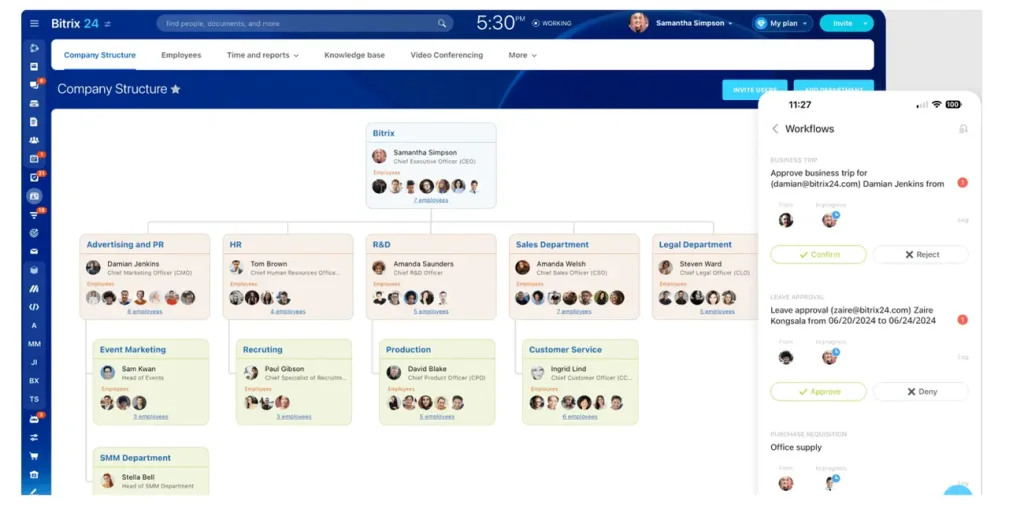 Bitrix24 traktuje onboarding jako integralną część szeroko pojętych procesów HR i zarządzania pracą, a nie jako oddzielną funkcję. Platforma wykorzystuje swoje wbudowane narzędzia do zarządzania zadaniami, automatyzacji przepływów pracy, komunikacji wewnętrznej oraz moduł HRMS do stworzenia ustrukturyzowanego, ale elastycznego procesu wdrażania nowych pracowników. Mocną stroną Bitrix24 jest możliwość centralizacji wielu aspektów onboardingu w jednym miejscu.