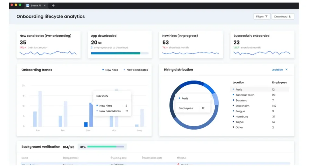 Leena AI to platforma, która najbardziej kompleksowo ze wszystkich w tym zestawieniu stawia na automatyzację onboardingu za pomocą AI. Jej rdzeniem jest konwersacyjna sztuczna inteligencja, która przejmuje znaczną część interakcji informacyjnej i administracyjnej z nowym pracownikiem. AI odpowiada na pytania 24/7, personalizuje dostarczane informacje, automatyzuje zadania i powiadomienia. Analiza konwersacji i danych z procesu pozwala na identyfikację problemów i ciągłe doskonalenie onboardingu.