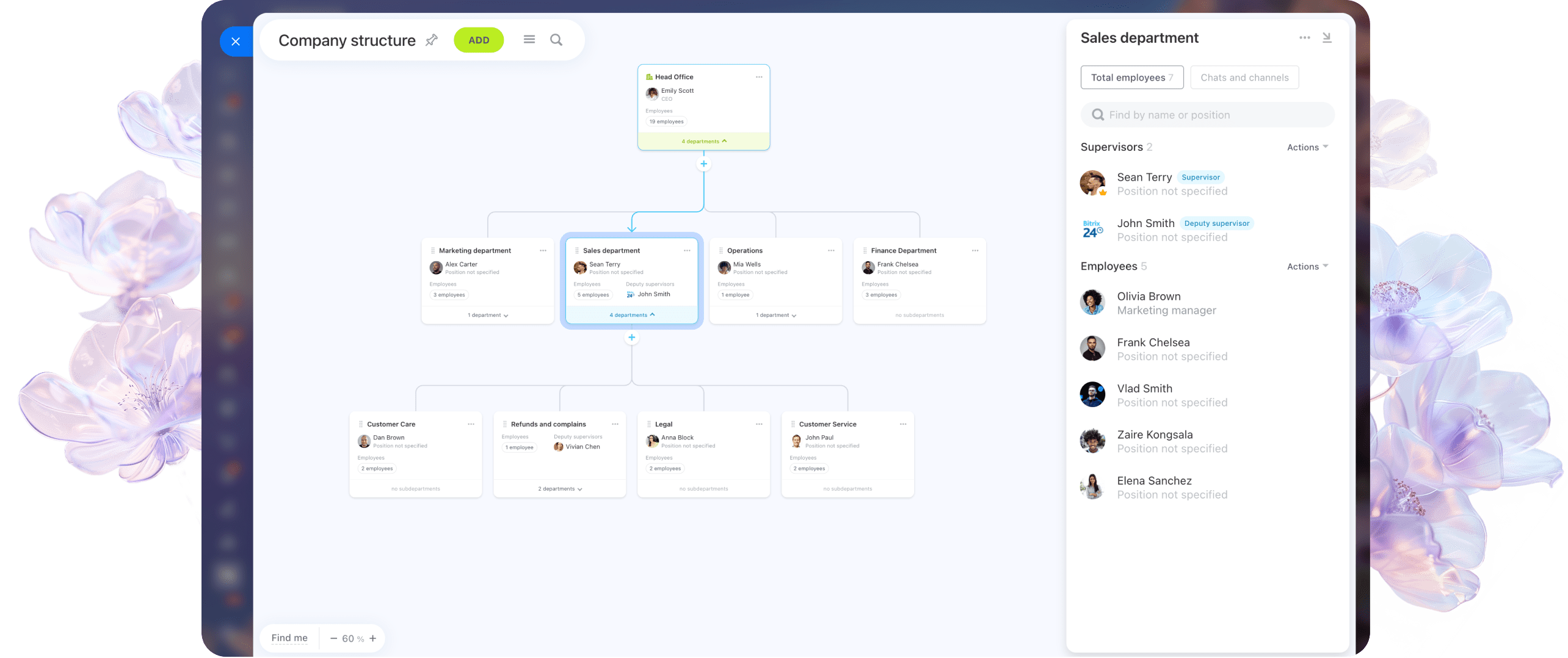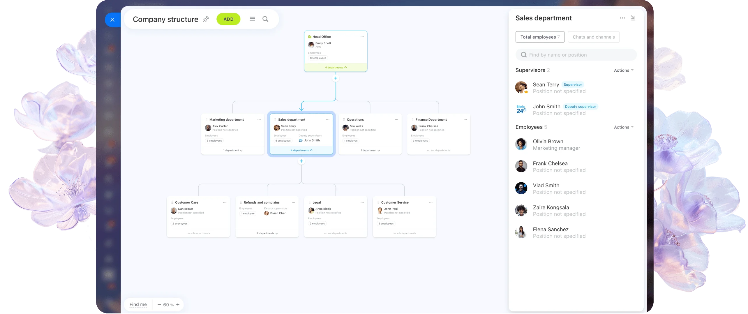 Wyświetl i edytuj strukturę swojej firmy na jednej interaktywnej mapie. Przeciągaj i upuszczaj pracowników, działy lub role, aby natychmiast odzwierciedlić aktualną strukturę zespołu.