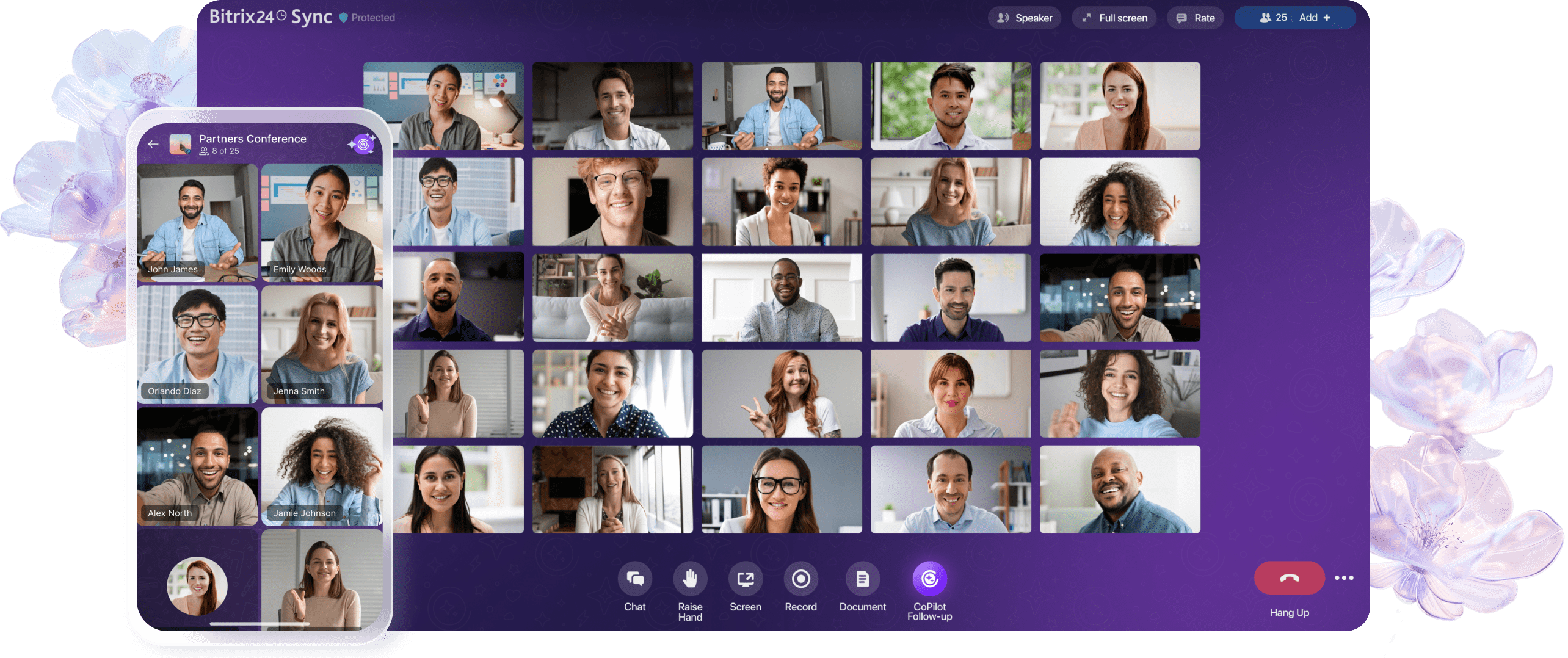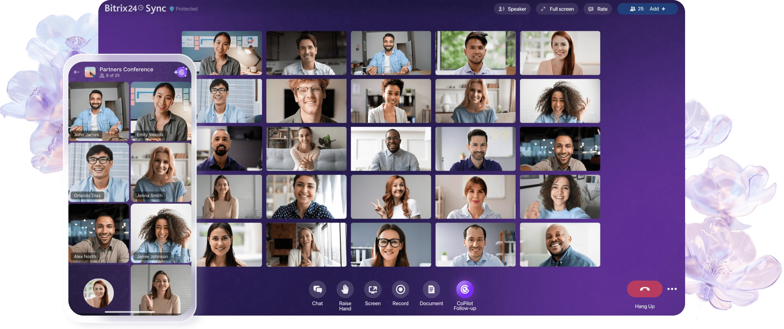 Rozpocznij połączenie od razu z poziomu czatu, zadania, deala lub wydarzenia w kalendarzu. Wyciszaj i włączaj mikrofony oraz wyróżniaj uczestników podczas połączenia – nawet na spotkaniach online z setkami uczestników.