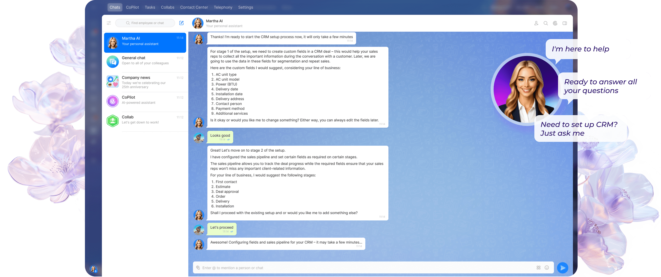Osadzona w całym Bitrix24, Martha jest zawsze gotowa, aby odpowiedzieć na pytania o funkcje produktu, najlepsze praktyki i nie tylko. Może nawet przeprowadzić nowych pracowników przez proces onboardingu!