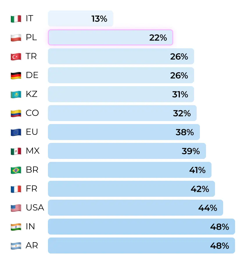 Wbrew pozorom, nie wszyscy lubią włączać kamerę podczas wideorozmów. Z badania wynika, że średnio 40% połączeń wideo odbywa się przy wyłączonej kamerze. Jeśli przyjrzymy się poszczególnym krajom, w Ameryce Łacińskiej odsetek ten wynosi aż 49%. Z kolei Polacy coraz częściej pokazują się podczas rozmów, zaledwie 22% połączeń w Polsce odbywa się bez włączonej kamery. Liderem w tym temacie są Włochy, gdzie odsetek ten to zaledwie 13%.