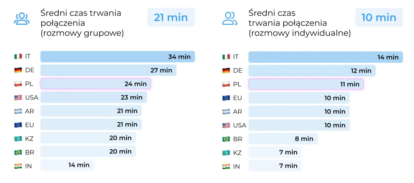 Najkrótsze rozmowy grupowe prowadzą użytkownicy z Indii, gdzie średnia wynosi 14 minut, czyli ponad dwa razy mniej niż we Włoszech. W Polsce czas rozmowy jest zbliżony do wartości globalnych – około 24 minut dla połączeń grupowych i niecałe 12 minut dla rozmów jeden na jeden.