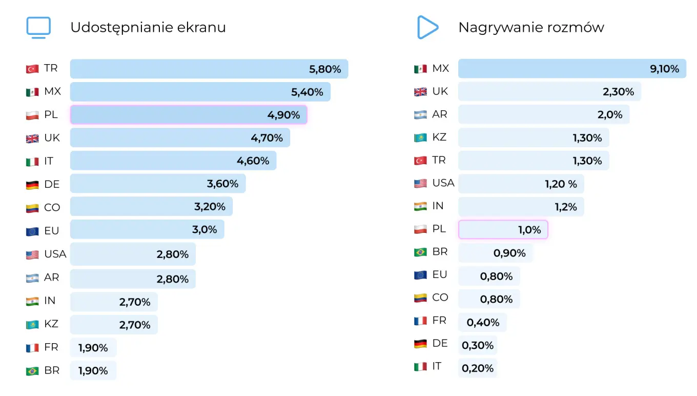 Z kolei użytkownicy z Meksyku chętnie nagrywają rozmowy: prawie 10% wszystkich połączeń jest tam rejestrowanych, podczas gdy w Polsce to zaledwie około 1%.