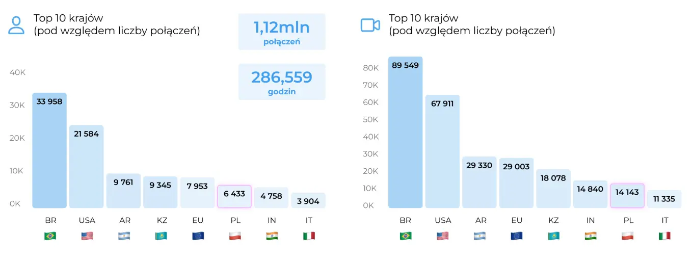 Najmniejsze spotkania online odnotowano w Niemczech – średnio 3,2 osoby, co stanowi 27% mniej niż globalna średnia. Największe grupy można spotkać w Azji Centralnej, gdzie w Kazachstanie grupowe rozmowy obejmują zazwyczaj ponad 4 osoby. W Polsce ten wskaźnik jest zbliżony do średniej światowej, wynoszącej około 4 osoby.