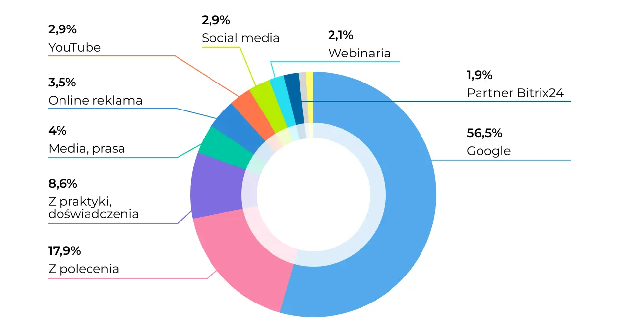 56,5%) dowiaduje się o Bitrix24 dzięki wyszukiwarce Google, co podkreśla znaczenie silnej obecności online i skutecznego marketingu SEO. Firmy coraz częściej polegają na wynikach wyszukiwania, aby znaleźć szczegółowe porównania, opinie użytkowników i analizy funkcji przed podjęciem decyzji o wyborze platformy.