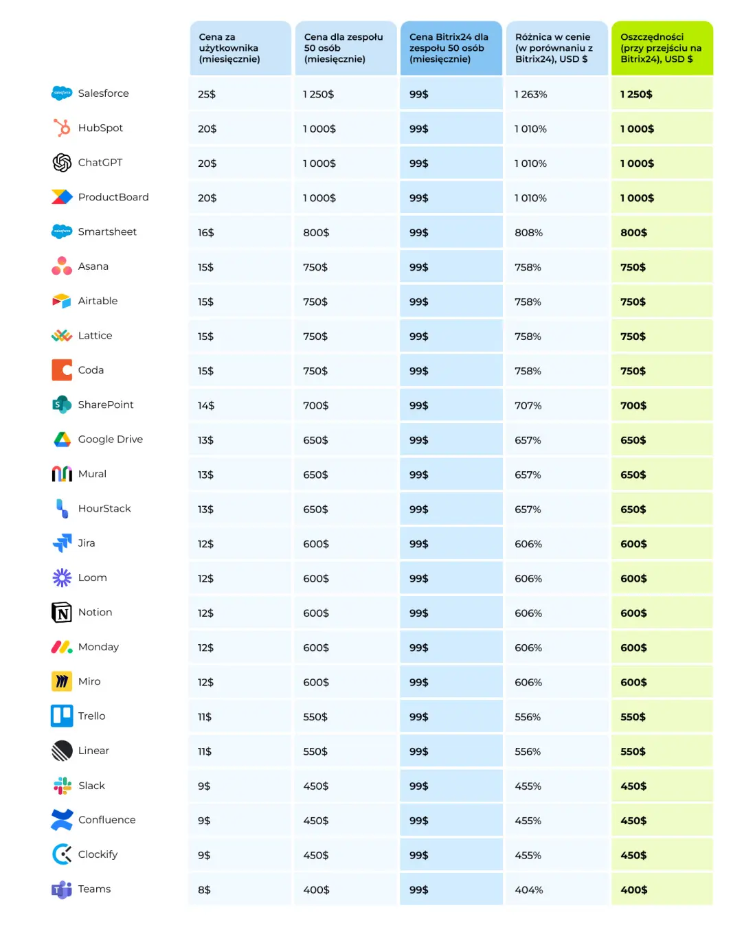 Różnica cenowa między Bitrix24 a Salesforce sięga 1 250%.