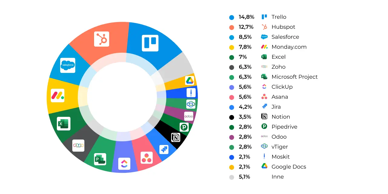 - Trello (14,8%) – silny gracz w obszarze zarządzania zadaniami i projektami.