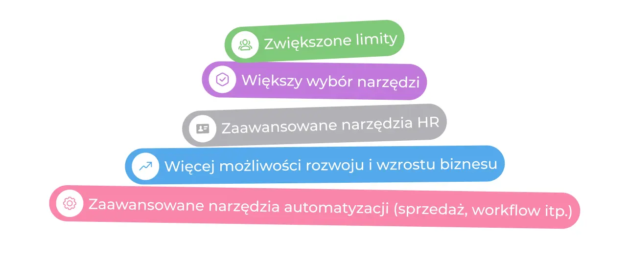Wyższe limity, w momencie kiedy firma się rozrasta, pojawia się potrzeba obsługi większej liczby użytkowników, zadań czy projektów.