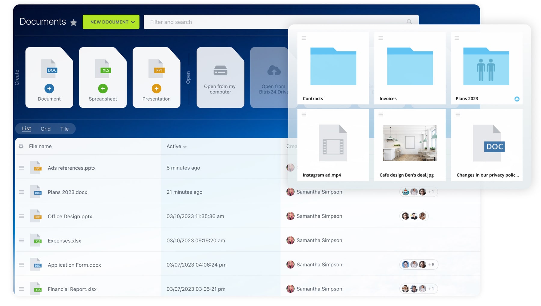 Przechowuj wszystkie pliki firmowe w jednym miejscu. Dzięki konfigurowalnym uprawnieniom dostępu firma może być lepiej zorganizowana. Oznaczaj wszystkie pliki i szybciej znajduj to, czego potrzebujesz, dzięki cyfrowej wyszukiwarce. Dzięki opcji przechowywania w chmurze Bitrix24 możesz uzyskać dostęp do plików z dowolnego miejsca, nawet podczas spotkań z klientami. Kolejną zaletą udostępniania i przechowywania plików jest możliwość zmniejszenia kosztów papieru i miejsca na dokumenty. Firmy mogą również zapewnić ograniczony dostęp klientom do udostępniania określonych plików, tworząc mniej bałaganu w skrzynce odbiorczej i usprawniając niektóre procesy.