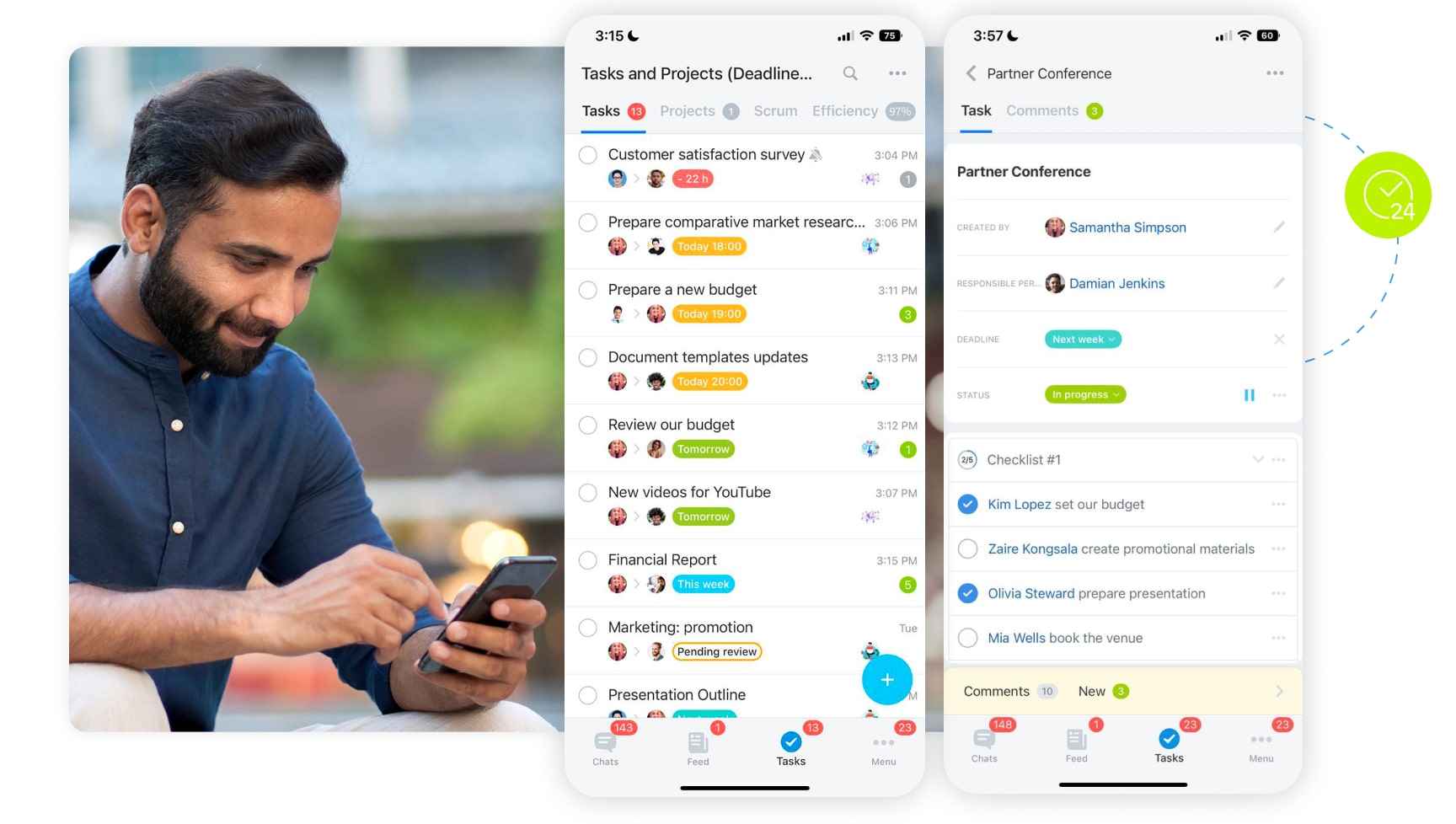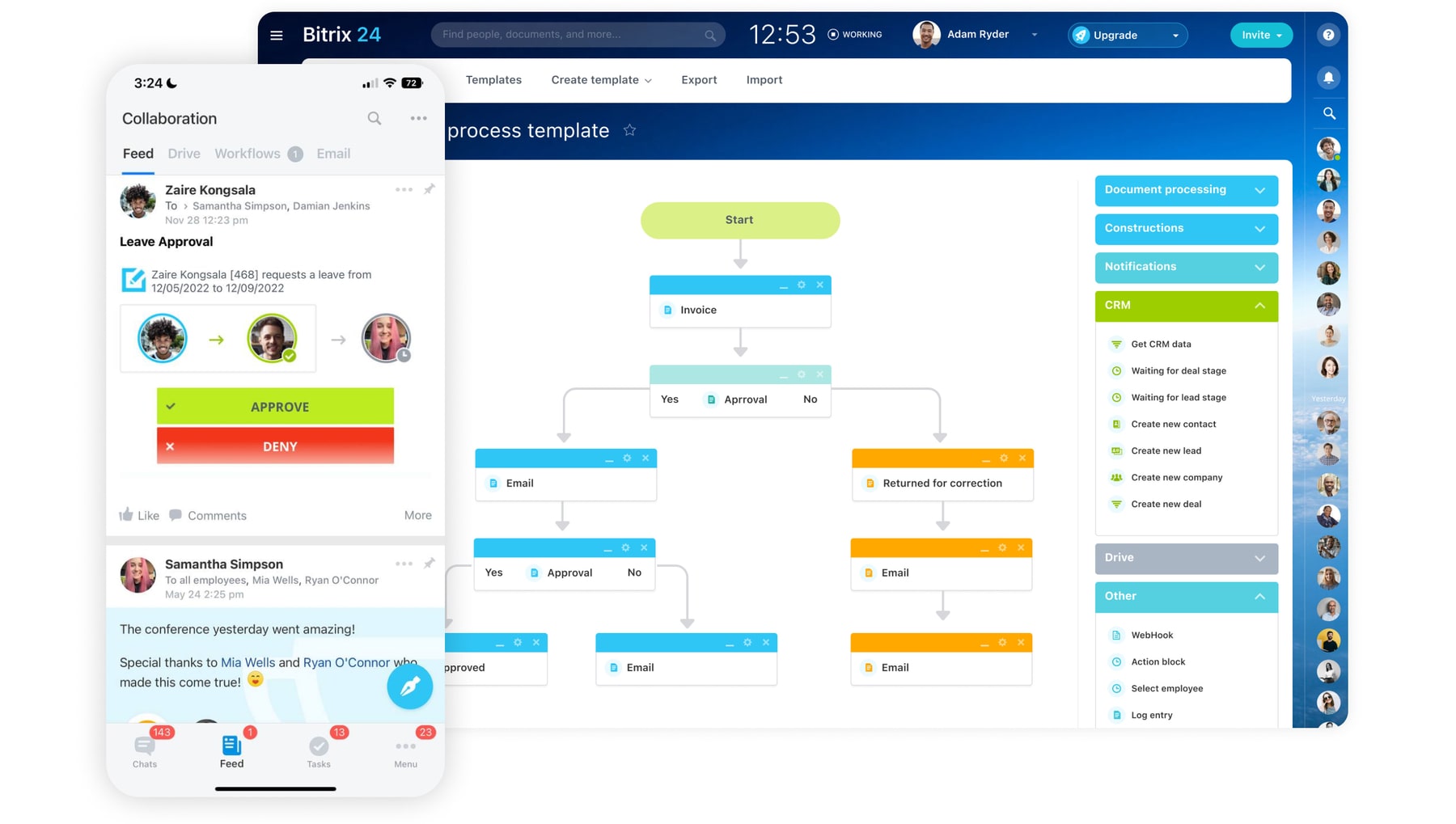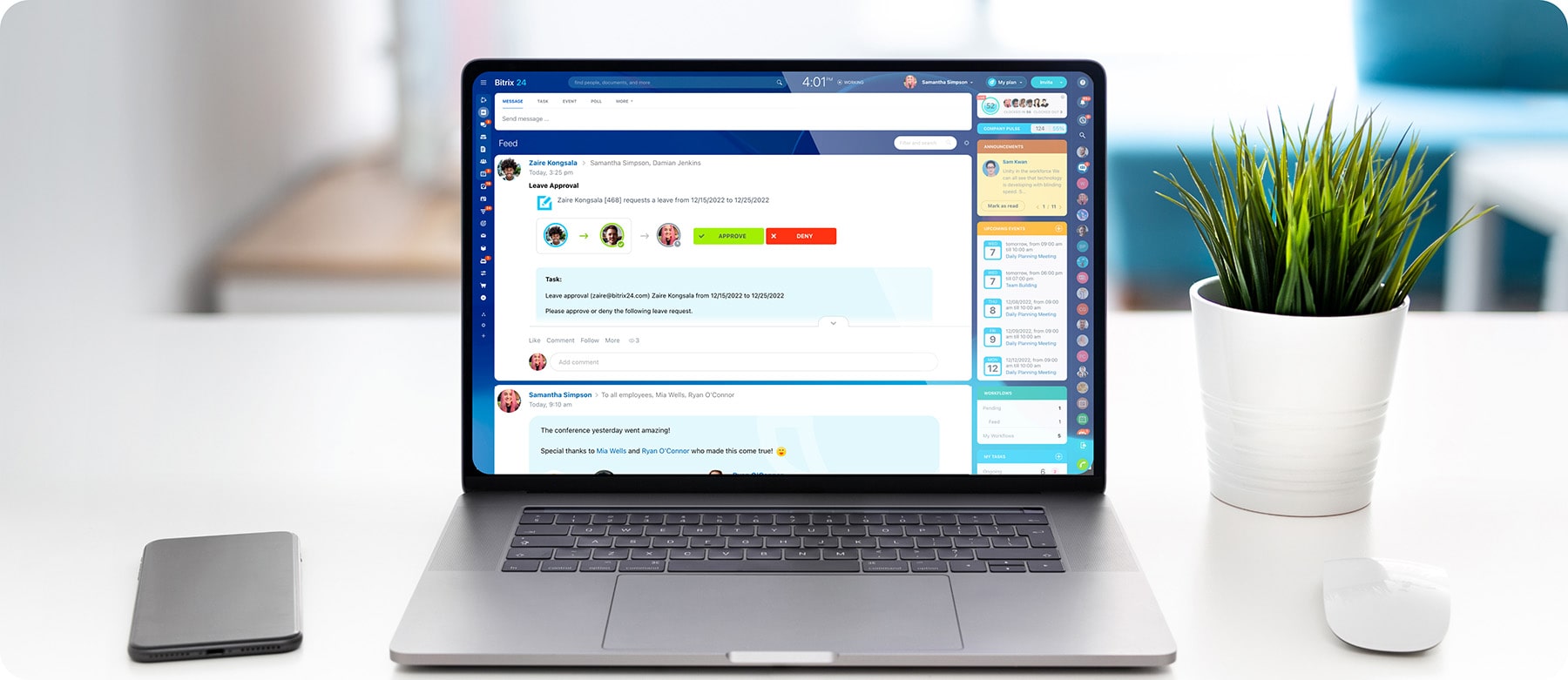 Korzystaj z Bitrix24 w podróży. Dzięki naszej łatwej w użyciu aplikacji mobilnej możesz mieć dostęp do wszystkiego, co oferuje Bitrix24 na komputerze stacjonarnym, z poziomu smartfona. Uzyskaj większą elastyczność w zakresie lokalizacji i harmonogramu, korzystając z aplikacji. Jeśli firma zależy od pracowników przebywających w wielu lokalizacjach lub będących w ciągłym ruchu, dostęp do w pełni mobilnej aplikacji to wielka korzyść.