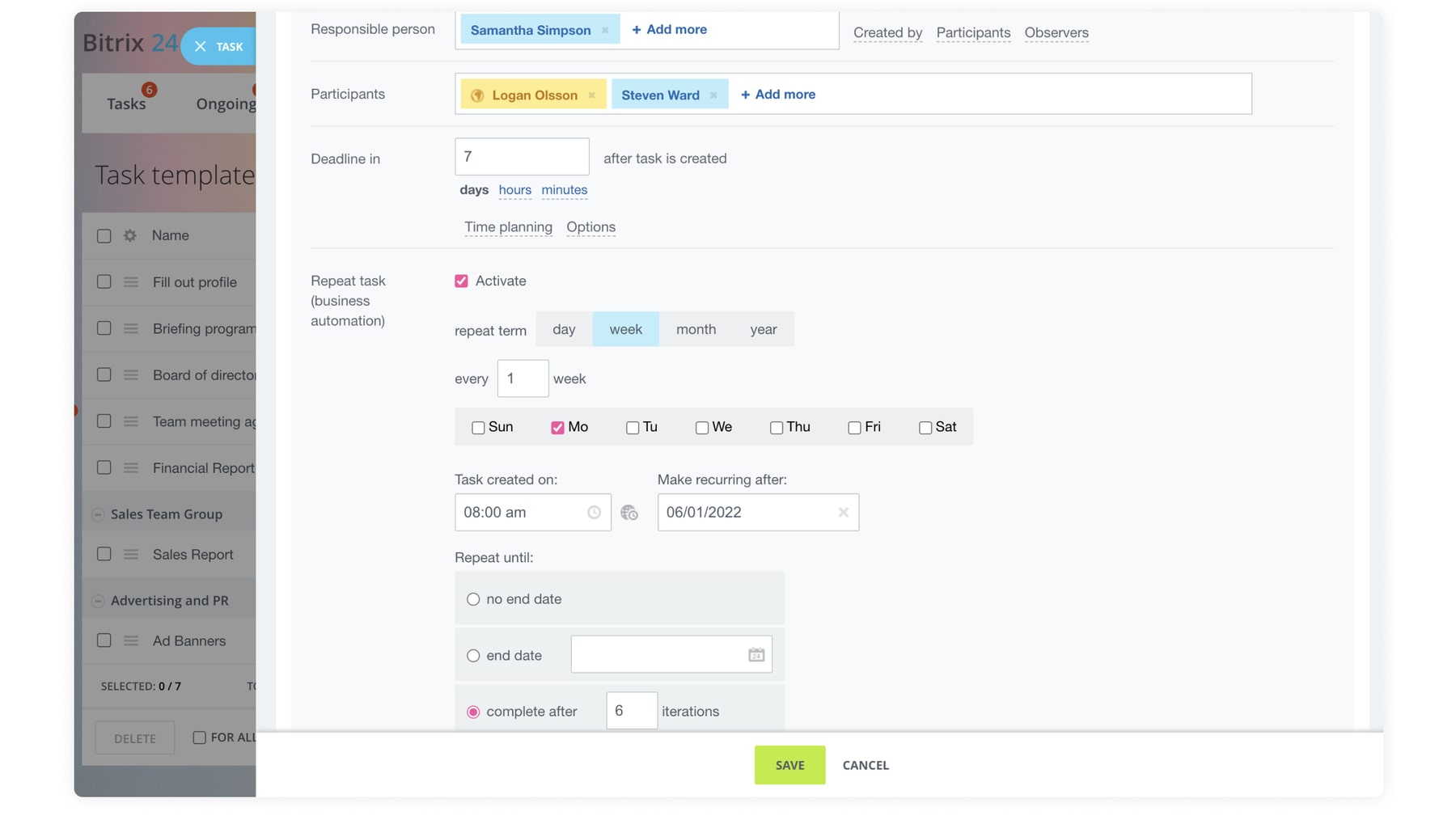Wiele zadań kierowników projektów powtarza się. Gdy nadchodzi czas przypisywania zadań tygodniowych i miesięcznych, kierownik musi je rozdzielić, aby zostały zrealizowane. Dzięki zautomatyzowanym przepływom pracy kierownicy projektów mogą jednorazowo przydzielić zadanie i skonfigurować automatyzację. Automatyzacja to korzyść z posiadania konfigurowalnych szablonów. Zadania można łatwo ustawić na co tydzień, co dwa tygodnie, co miesiąc lub co 10 dni, w zależności od indywidualnych potrzeb. Dzięki temu kierownicy projektów nie muszą tracić czasu na przydzielanie tych samych zadań na początku każdego tygodnia, co daje im większą swobodę w innych zadaniach.