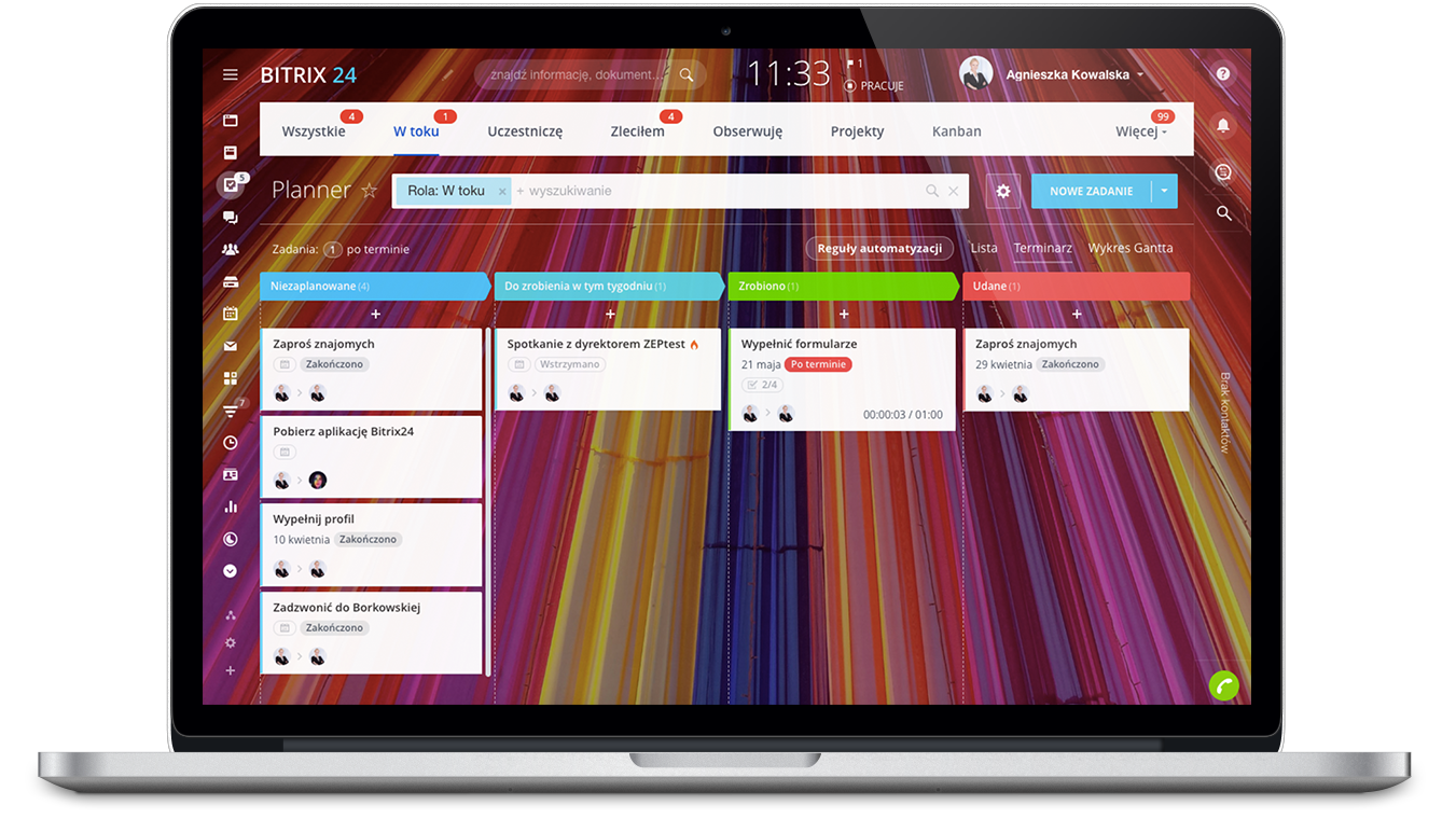 Błędy w zarządzaniu, przekroczone terminy, niezsynchronizowane zadania – zarządzanie projektem nigdy nie jest łatwe, o czym już na pewno wiesz. Niektórych niepowodzeń po prostu nie da się przewidzieć, ale jeśli dysponujesz skutecznymi narzędziami, możesz rozwiązać każdy problem. Gdy trzeba coś zdefiniować, uporządkować lub przypisać, Bitrix24 służy pomocą. Zwiększanie produktywności i zarządzanie workflow jeszcze nigdy nie było tak proste, podobnie jak realizacja projektów. Ciesz się tym, co najbardziej lubisz w pracy, a resztę przełącz na autopilota.