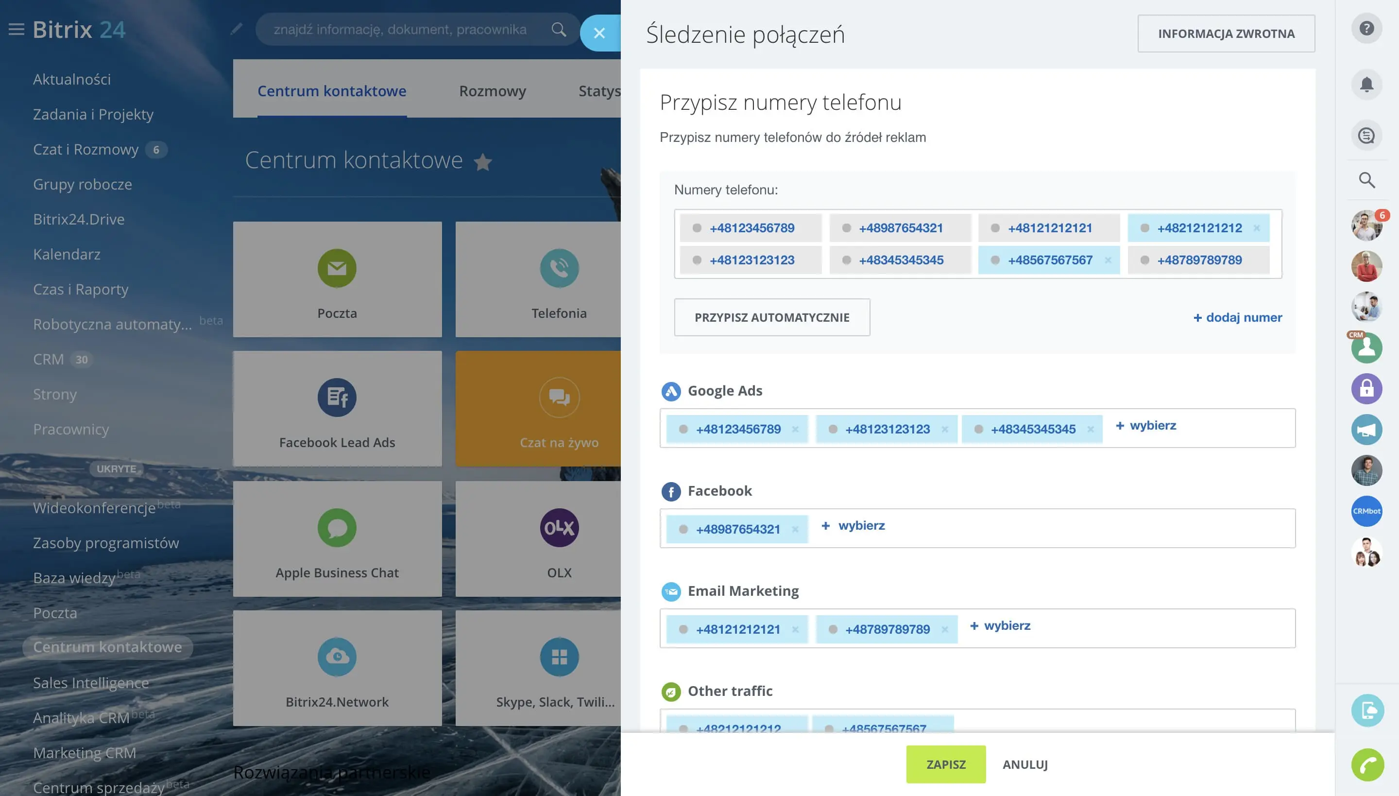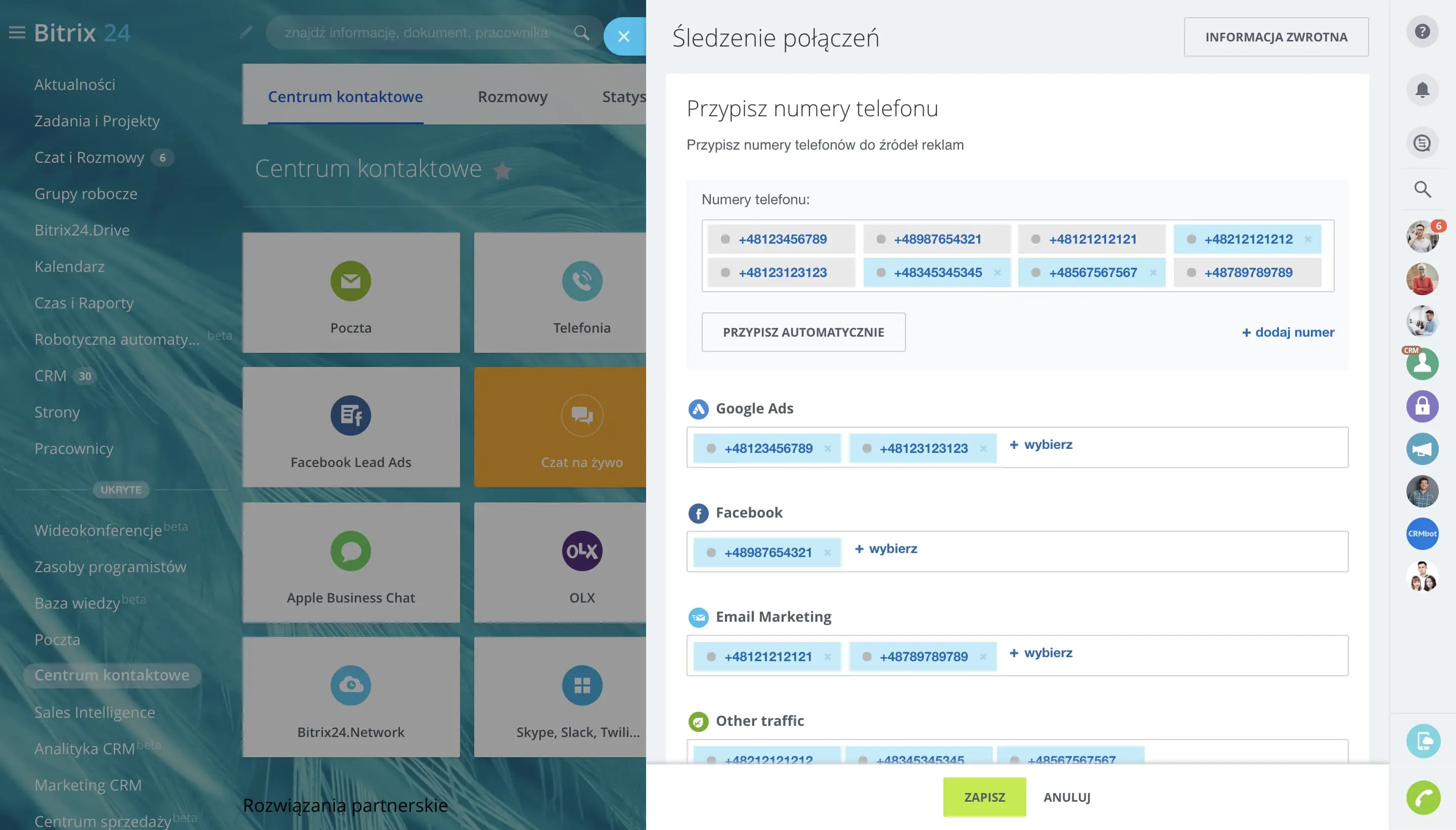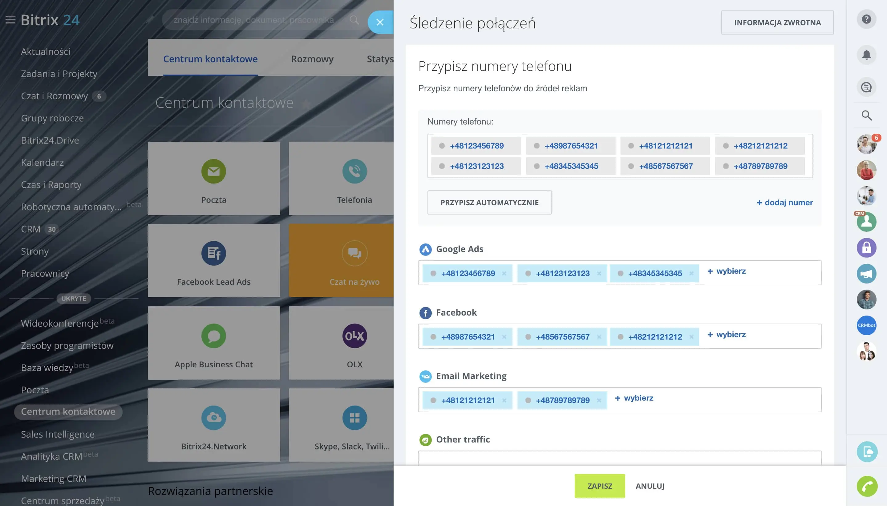 Telefonia Bitrix24 umożliwia wynajmowanie lokalnych numerów telefonów, tworzenie wewnętrznych rozszerzeń dla pracowników, konfigurowanie kolejkowania i przekazywania połączeń, i nie tylko.