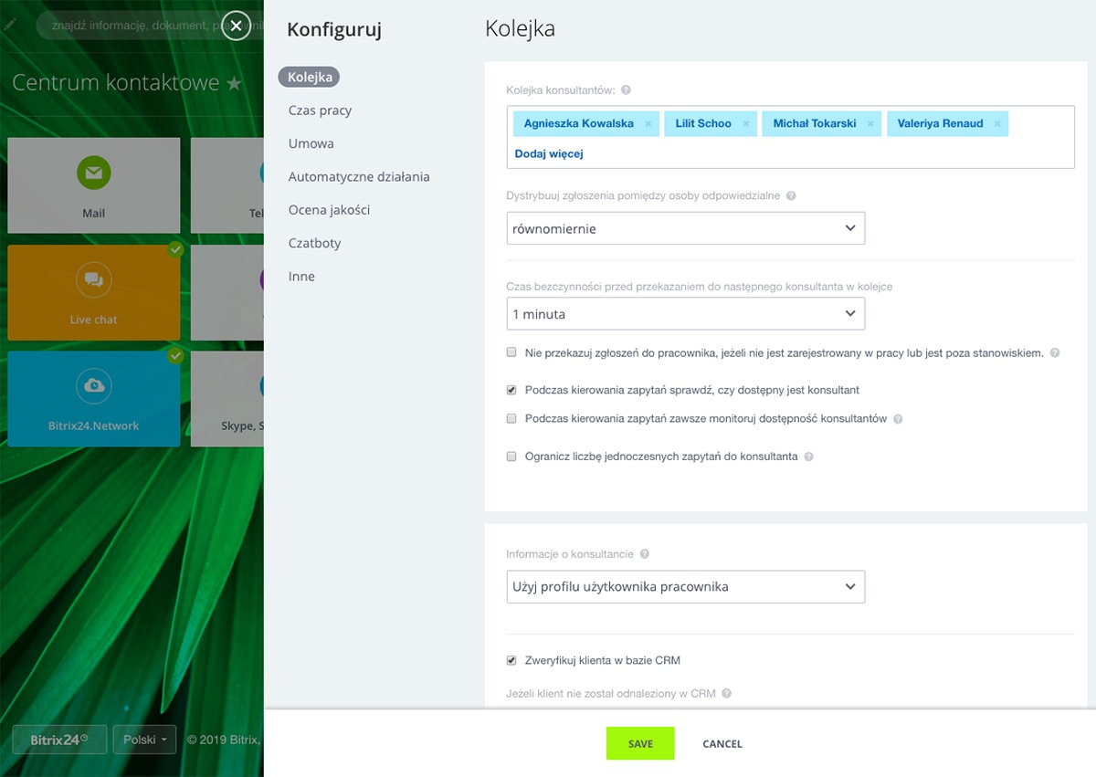 Telefonia Bitrix24 umożliwia wynajmowanie lokalnych numerów telefonów, tworzenie wewnętrznych rozszerzeń dla pracowników, konfigurowanie kolejkowania i przekazywania połączeń, i nie tylko.