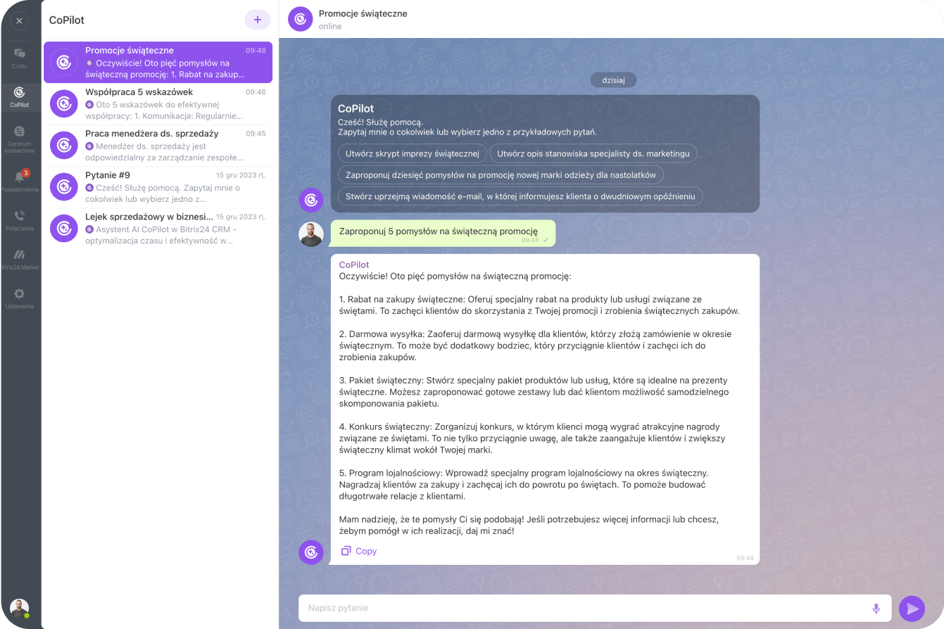 Jednym z najbardziej oczywistych miejsc, gdzie można znaleźć CoPilota w Bitrix24, jest nasz czat. Można go tam używać do znajdowania pomysłów, pisania tekstów i poznawania różnego rodzaju magii sztucznej inteligencji.