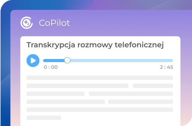 Zakończyłeś rozmowę telefoniczną z klientem po 35 minutach? Nie musisz wracać i słuchać jej od nowa – nasz CoPilot dokona transkrypcji Twojej rozmowy w czytelnym formacie tekstowym.