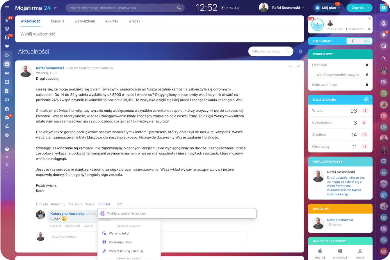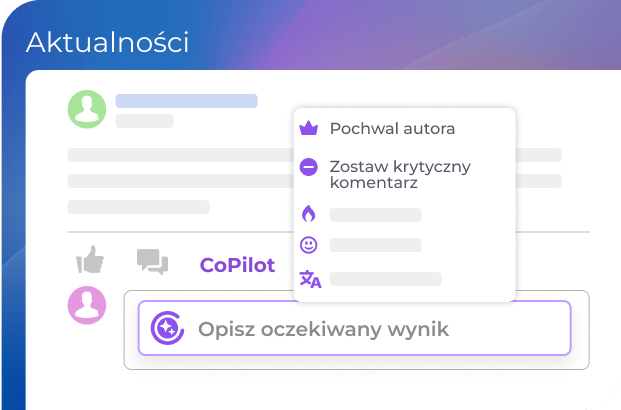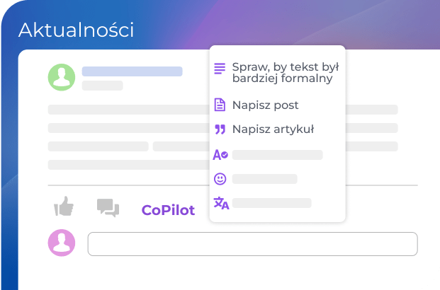 Jeśli chodzi o komunikację z zespołem, CoPilot działa jako Twój zaufany i kompetentny asystent. Może napisać ogłoszenie, odpowiedzieć na komentarz, zaproponować pomysł, a nawet konstruktywnie skrytykować.
