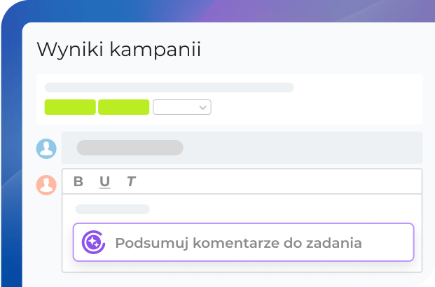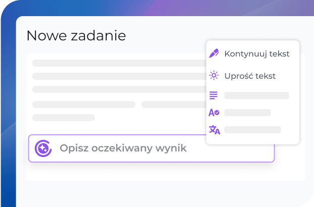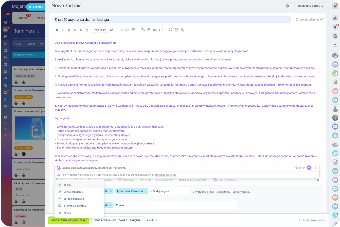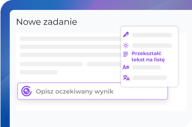 Twój osobisty asystent AI jest zawsze gotowy do pomocy, gdy planujesz projekt lub tworzysz nowe zadanie. CoPilot może z łatwością przygotować krótki i zrozumiały opis zadania w oparciu o Twój prompt, a nawet zaproponować listę kontrolną odpowiadającą zadaniu.