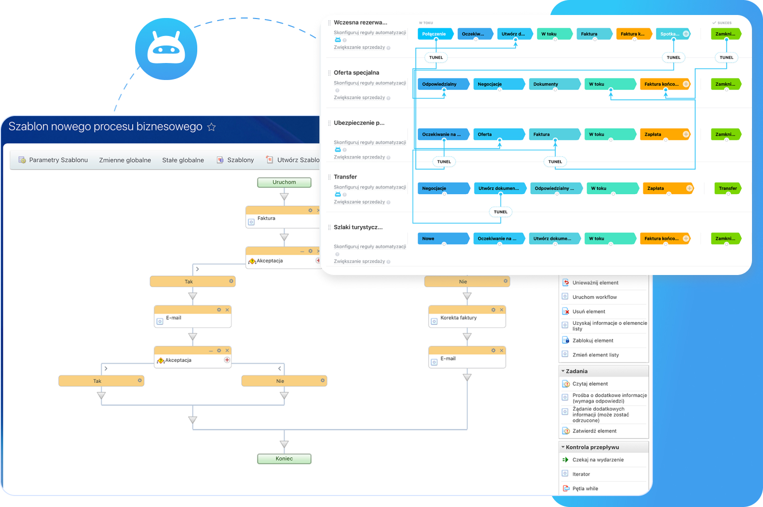 Pełen zestaw narzędzi do automatyzacji sprzedaży, w tym niestandardowe reguły i wyzwalacze, automatyzacja workflow, zautomatyzowane tunele, integracje z innymi aplikacjami i więcej.