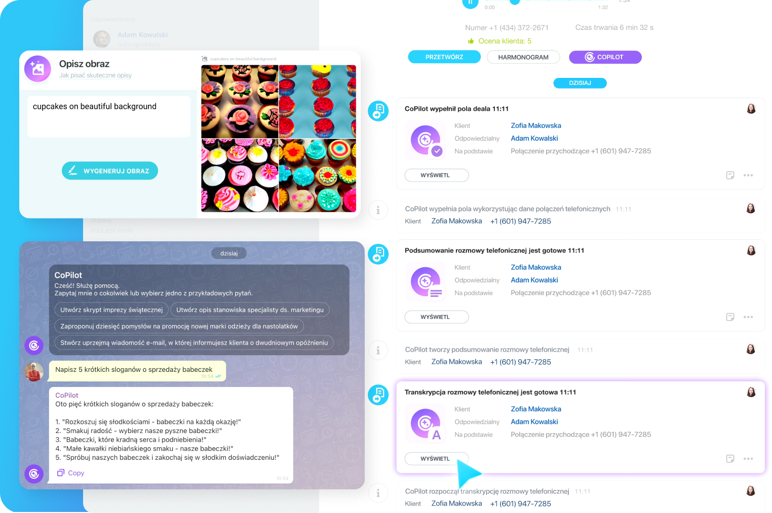 Korzystaj z CoPilot, darmowego asystenta obsługiwanego przez AI, aby tworzyć interesujące teksty marketingowe, generować nowe pomysły i tworzyć transkrypcje rozmów telefonicznych w CRM, automatycznie wypełniając przy tym pola w konkretnym leadzie lub dealu. Narzędzie do oceny obsługiwane przez AI pomoże Ci w prognozowaniu sprzedaży.