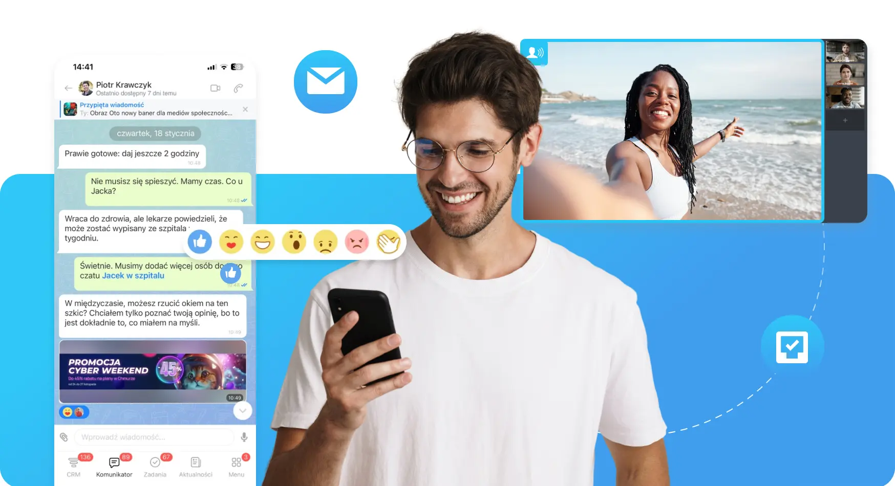 Oprócz narzędzi sprzedażowych i marketingowych w Bitrix24 znajdziesz również funkcje, które pomogą członkom Twojego zespołu sprawnie współpracować i komunikować się ze sobą. Należą do nich czat, połączenia wideo i telekonferencje, przechowywanie plików, kalendarz, dokumenty online, aplikacja do sprzedaży na urządzenia mobilne, zadania, śledzenie czasu pracy i nie tylko.