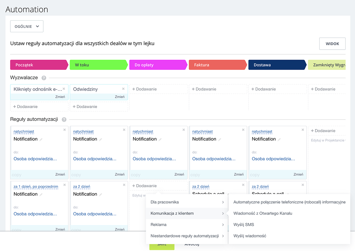 Wybierz jedną z wielu gotowych reguł i wyzwalaczy, aby zwiększyć produktywność członków zespołu sprzedażowego: wysyłając przypomnienia do klientów, powiadomienia do pracowników, ogłoszenia i inne.