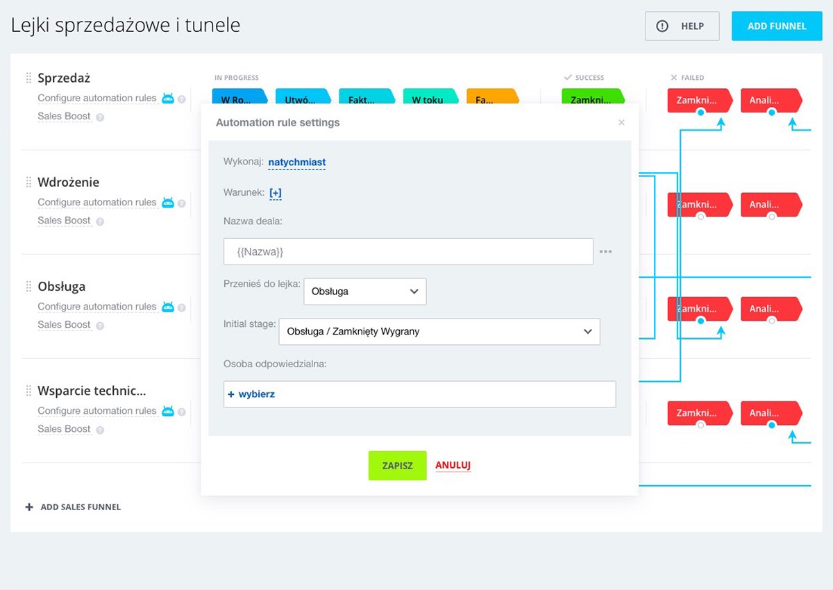 Jeśli Twój proces sprzedaży jest złożony, dobrze jest podzielić go na kilka lejków sprzedażowych, które można połączyć i zarządzać za pomocą tuneli sprzedażowych.