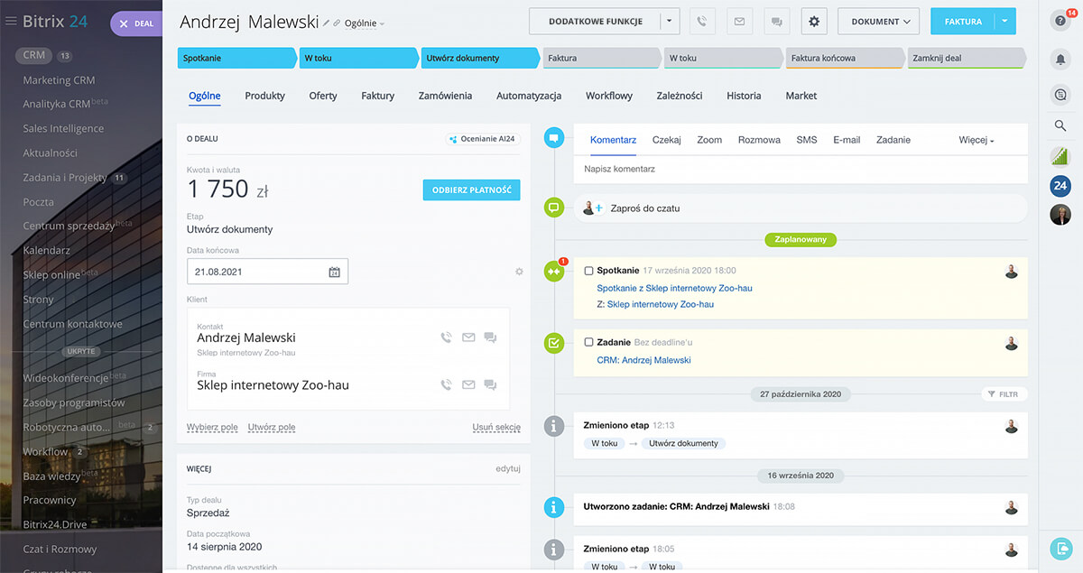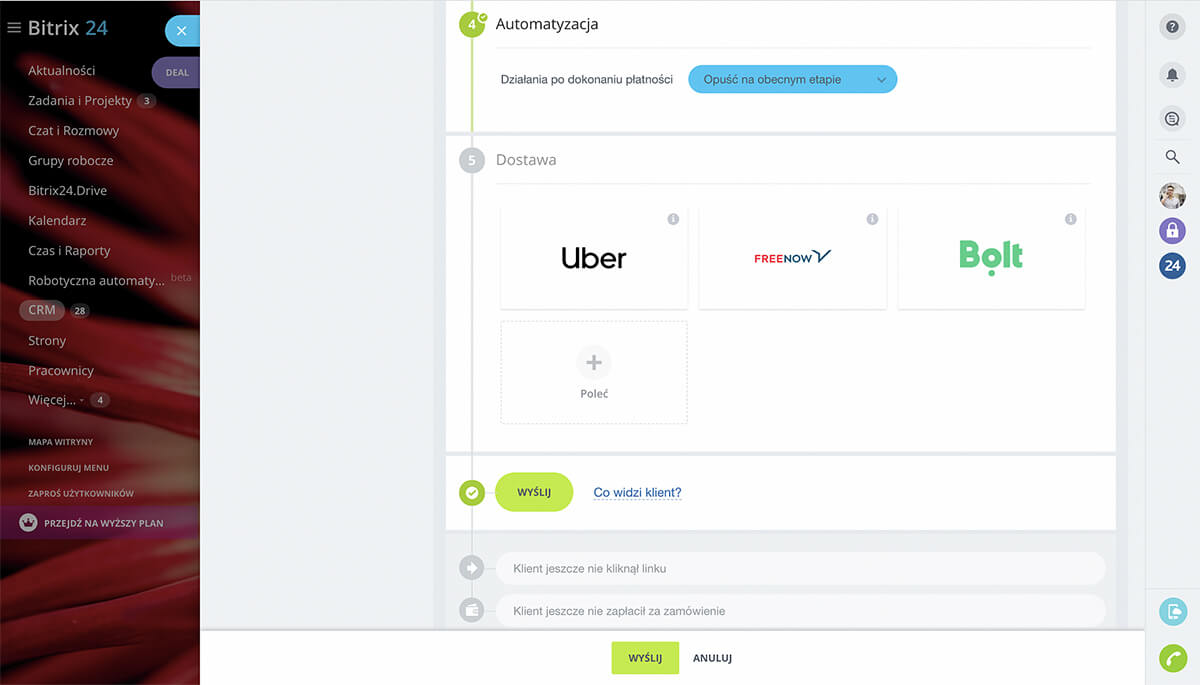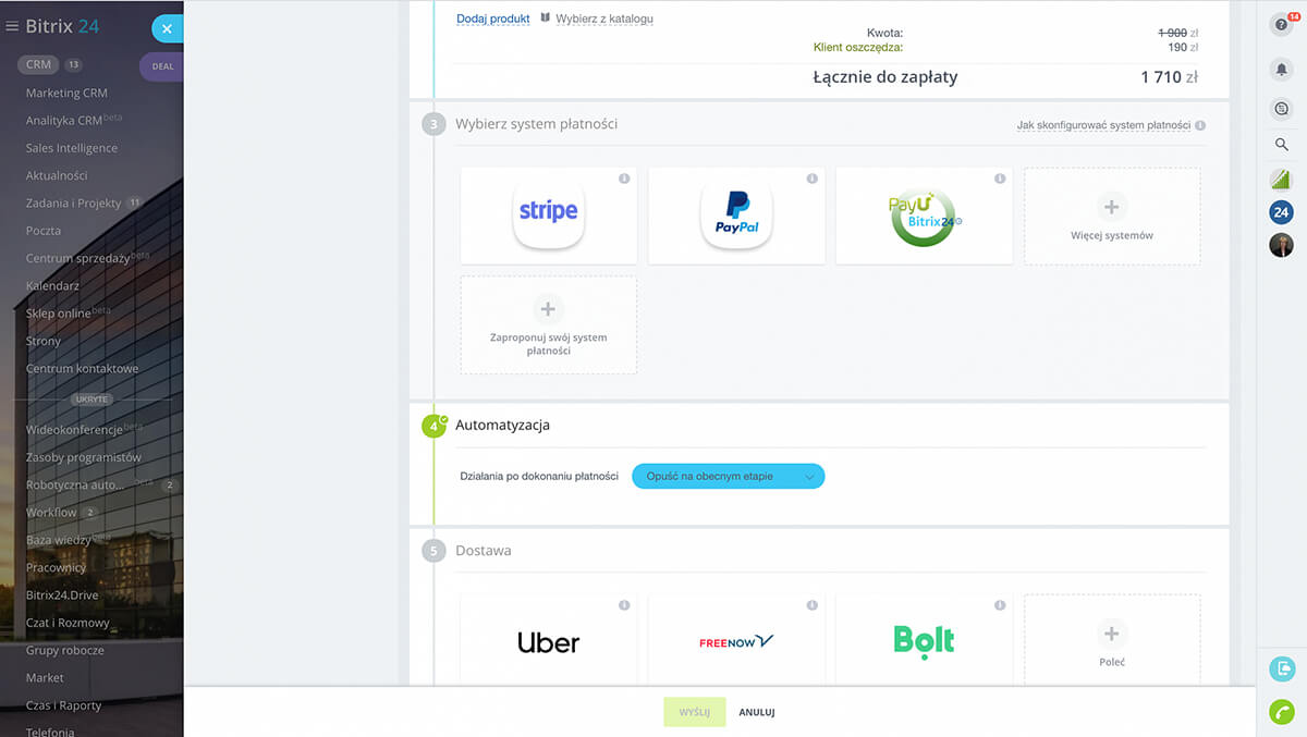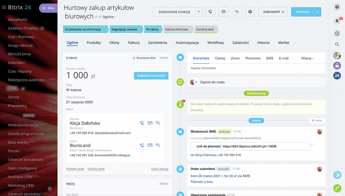 Dzięki Bitrix24 możesz łatwo przyjmować płatności za usługi i produkty online. Wystarczy wygenerować link do płatności bezpośrednio z dealu i przesłać go klientowi. Po zrealizowaniu płatności otrzymasz powiadomienie, a klient automatycznie otrzyma potwierdzenie transakcji.