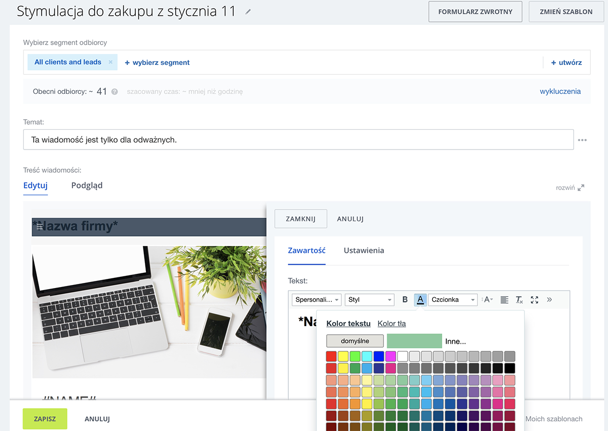 Możesz wysłać do 1 miliona wiadomości e-mail jednocześnie, bez potrzeby korzystania z płatnej usługi e-mail marketingu. Wybierz jeden z naszych szablonów lub stwórz własną wiadomość i zapisz ją jako szablon.