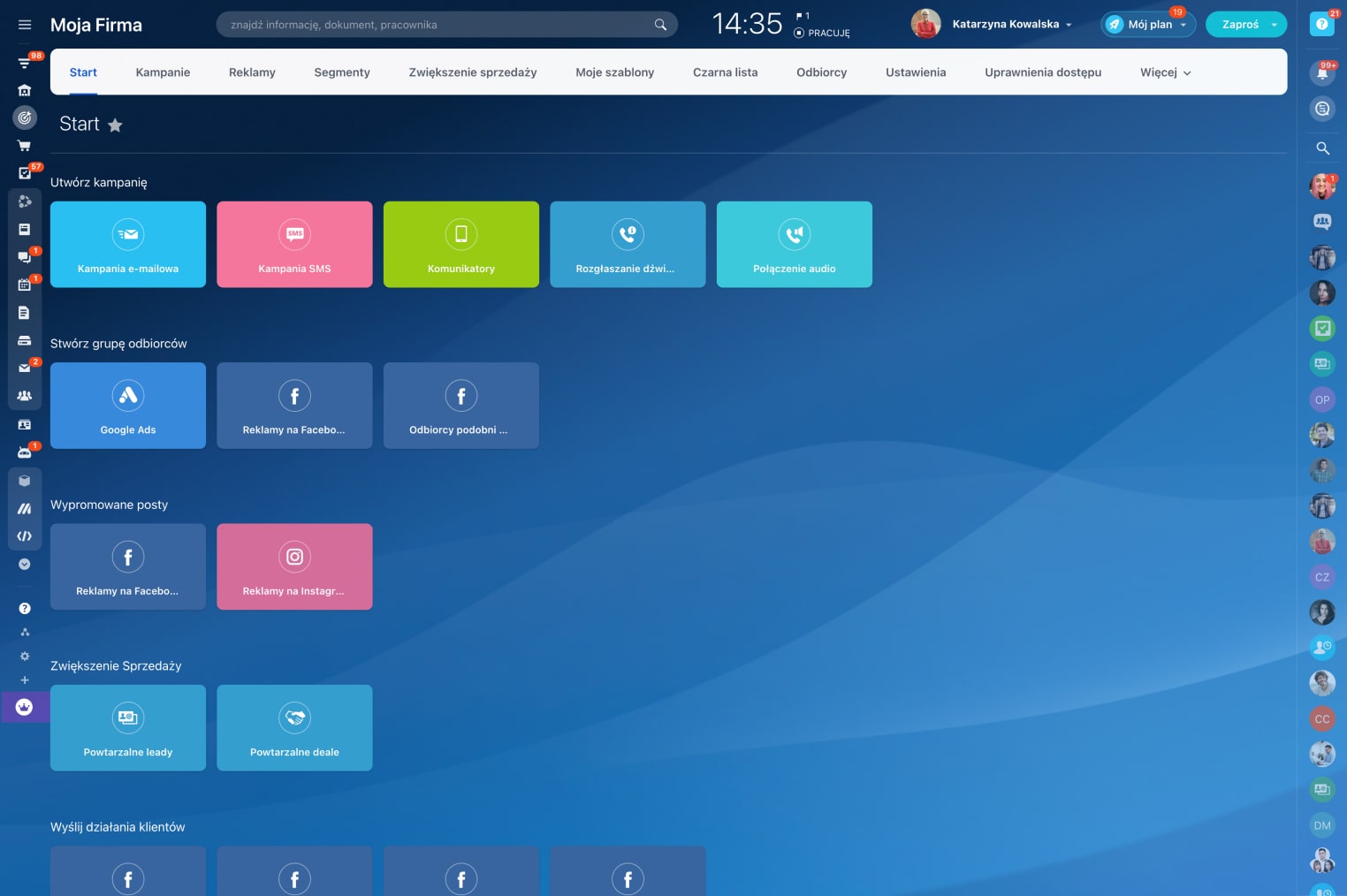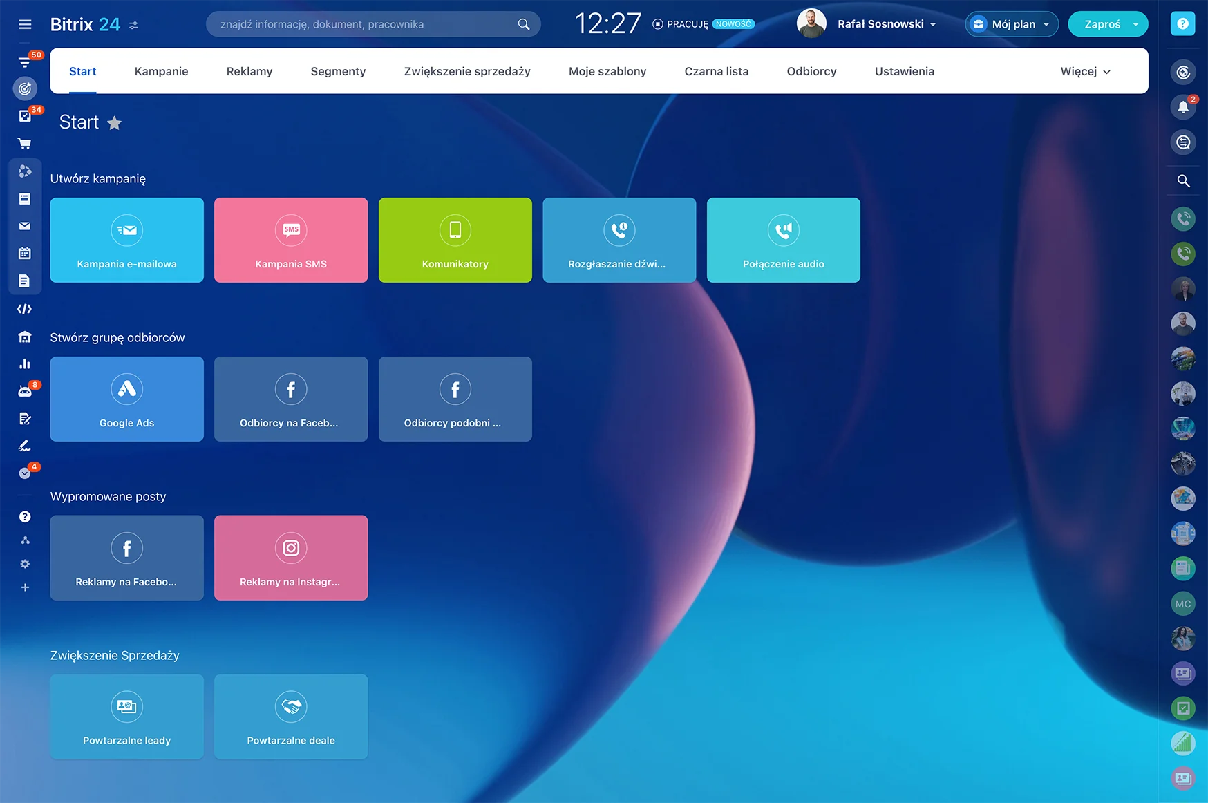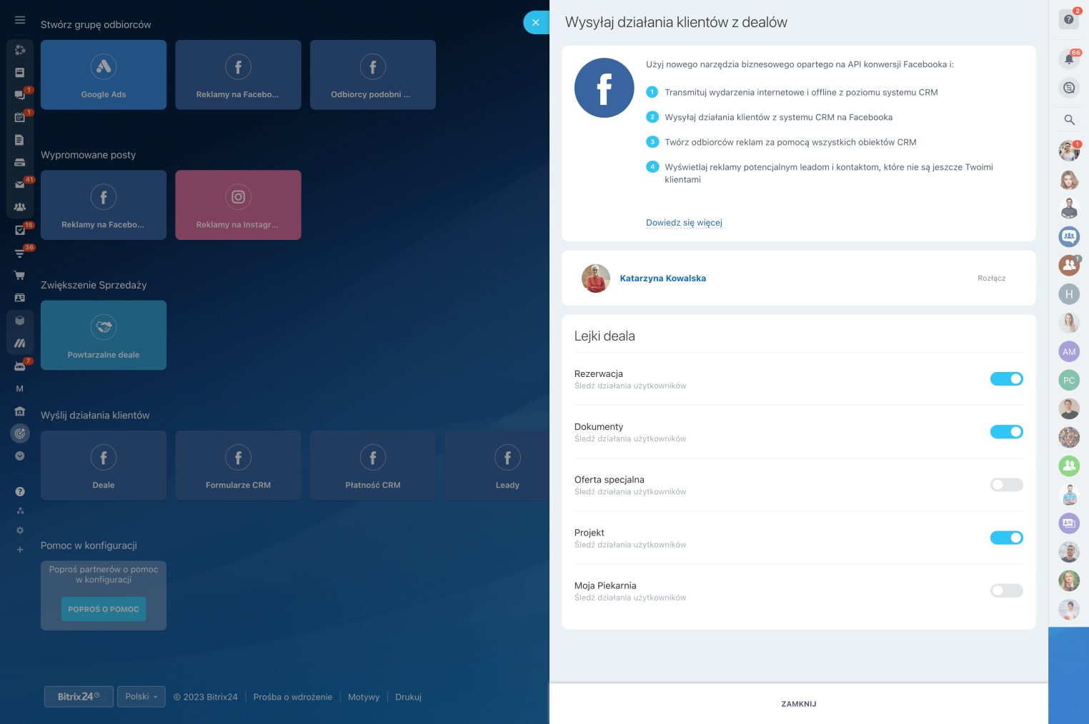 Oprogramowanie marketingowe CRM Bitrix24 pozwala połączyć się z kontem na Google lub Facebooku i prowadzić kampanie bezpośrednio z poziomu CRM.