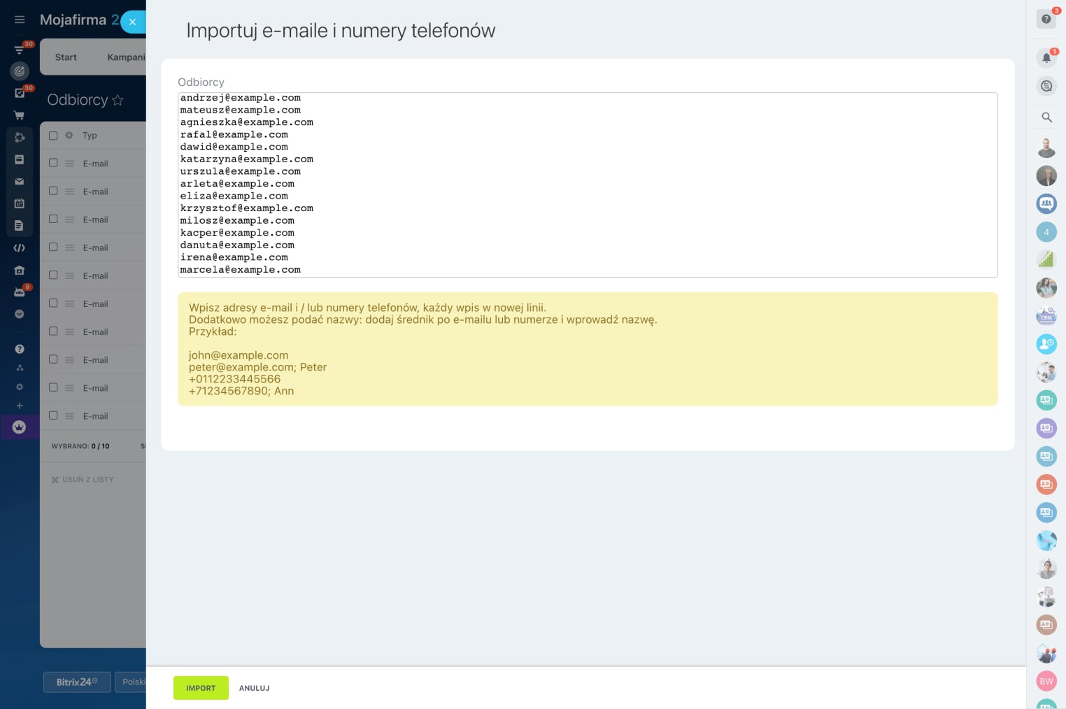 Bitrix24 to zaawansowany system CRM z funkcjami e-mail marketingu, oferujący również integracje z popularnymi platformami, takimi jak Twilio, Mailchimp, SendPulse i inne. Dzięki temu możesz łatwo importować i eksportować dane.