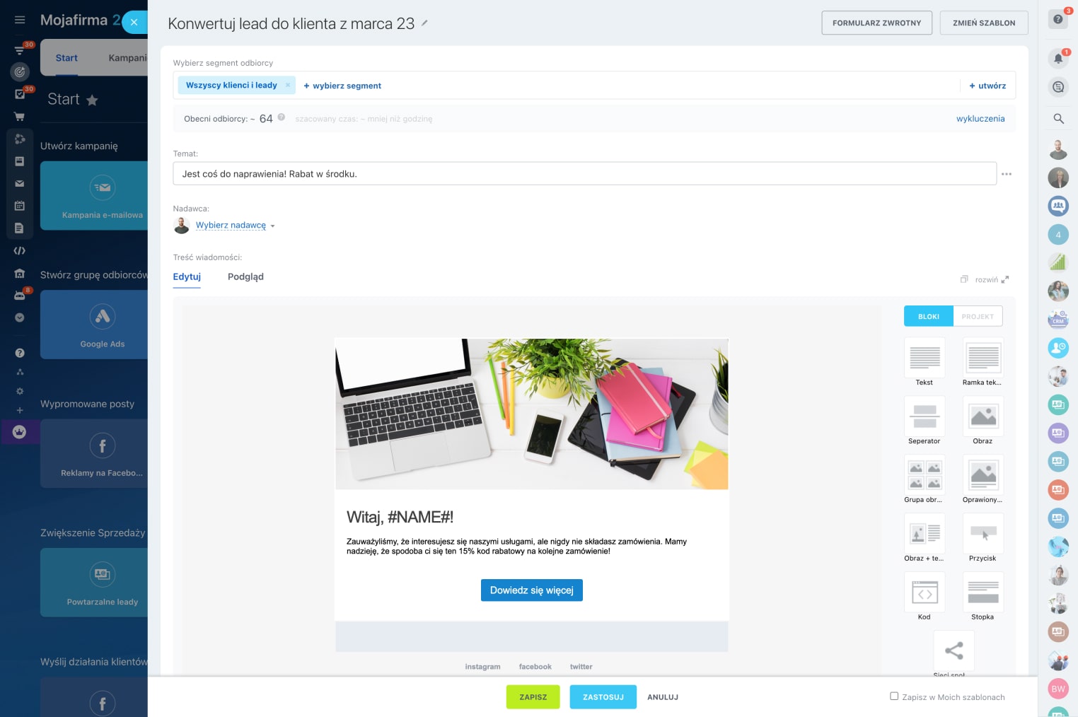 Wysyłaj wiadomości e-mail o treści promocyjnej, informacyjnej lub na inne tematy do kontaktów z Twojego CRM. Użyj reguł i wyzwalaczy do marketingu e-mail w naszym CRM, aby skonfigurować automatyczne wiadomości e-mail (na przykład wiadomości z potwierdzeniem zamówienia lub urodzinową zniżką).