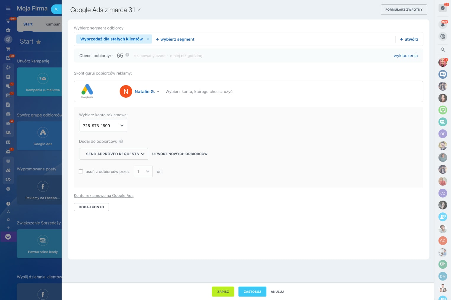 Możesz wybrać konkretny segment w bazie klientów i przesłać go bezpośrednio na konto reklamowe Google lub Facebooka, aby wyświetlać reklamy wyłącznie odbiorcom, którzy już mieli kontakt z Twoją marką.