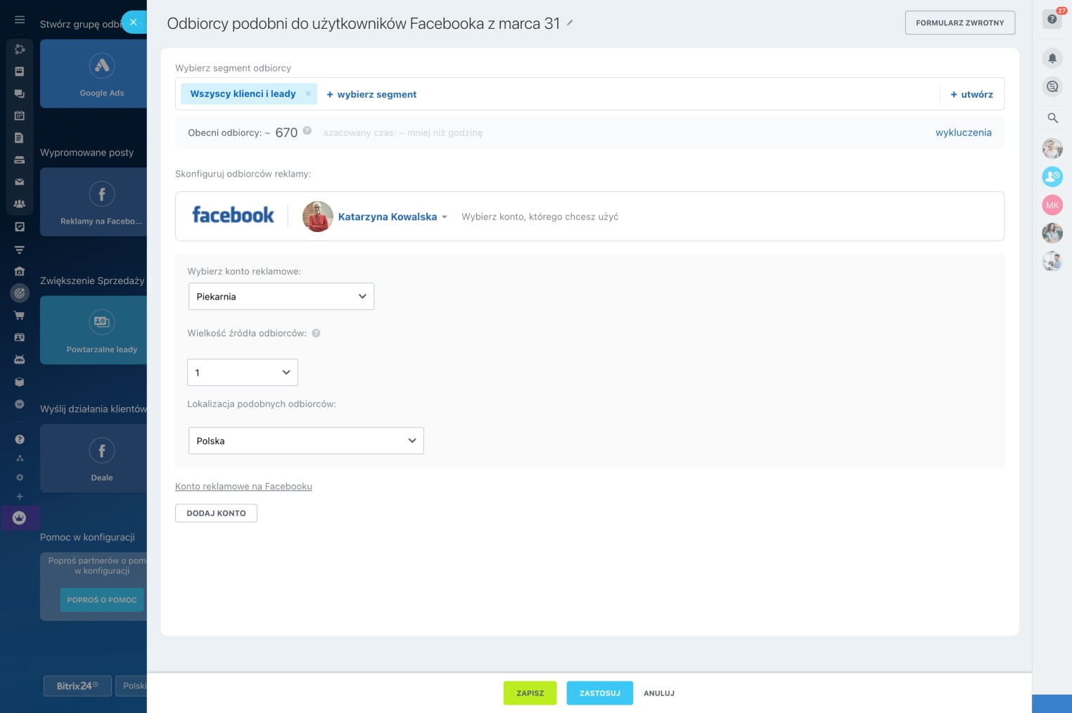 Uruchom kampanię reklamową na Facebooku lub Instagramie, kierując ją do odbiorców, którzy najlepiej odpowiadają Twoim obecnym segmentom. To świetny sposób na zwiększenie zwrotu z inwestycji – w pełni dostępny w narzędziu marketingowym CRM Bitrix24.