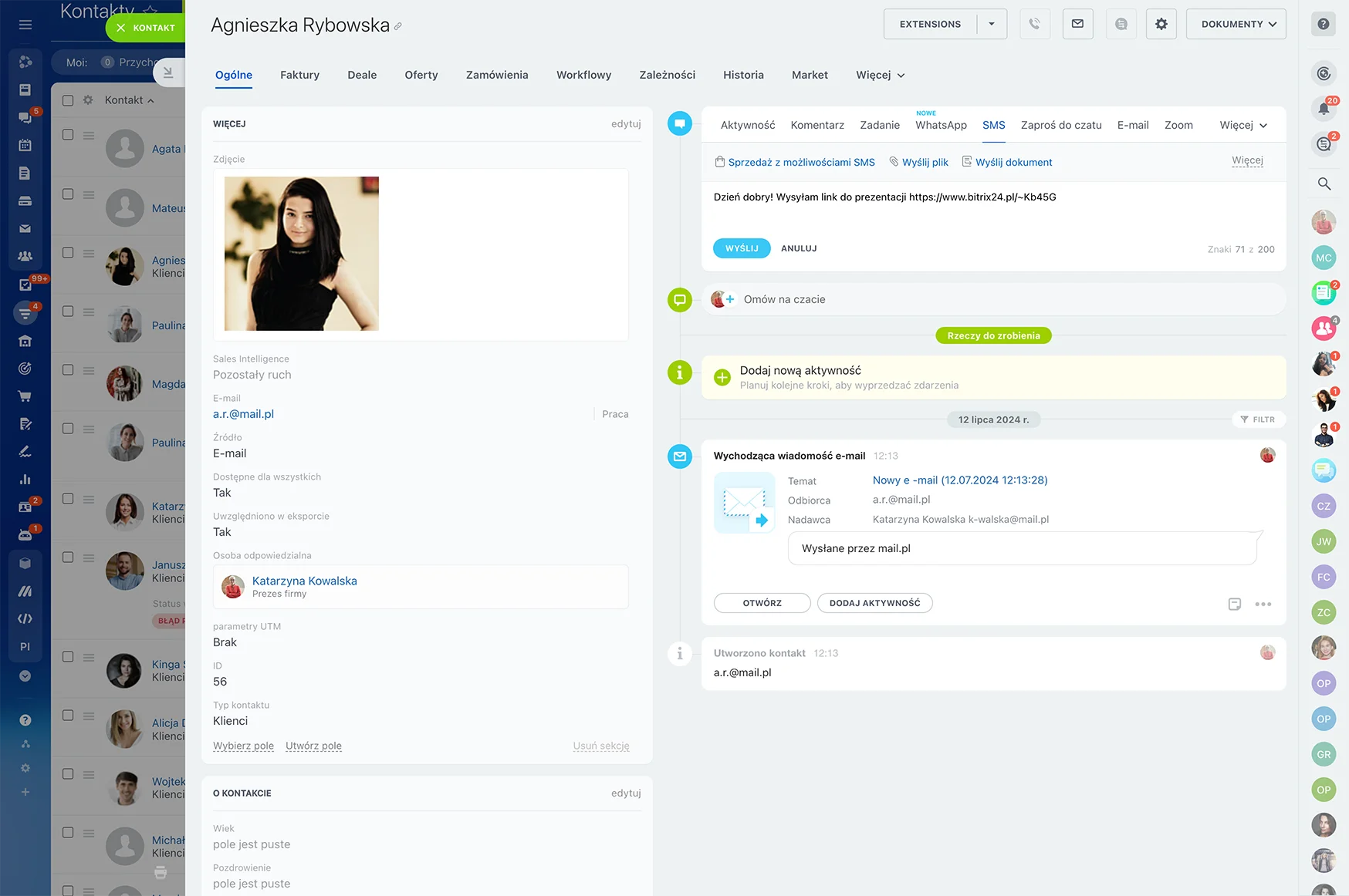 Każda wiadomość wysłana do klienta jest zapisywana na ich profilu w CRM (Kontakt), więc zawsze możesz śledzić historię swoich interakcji.