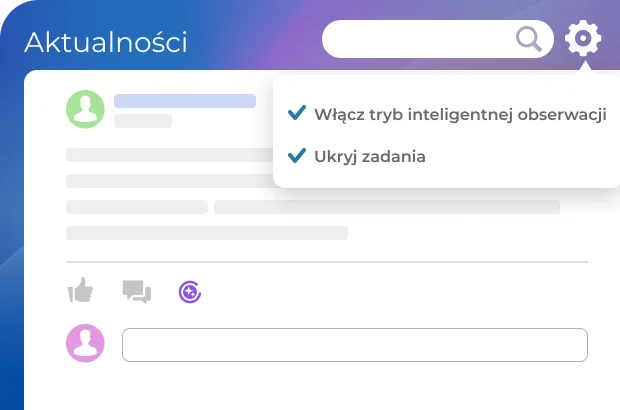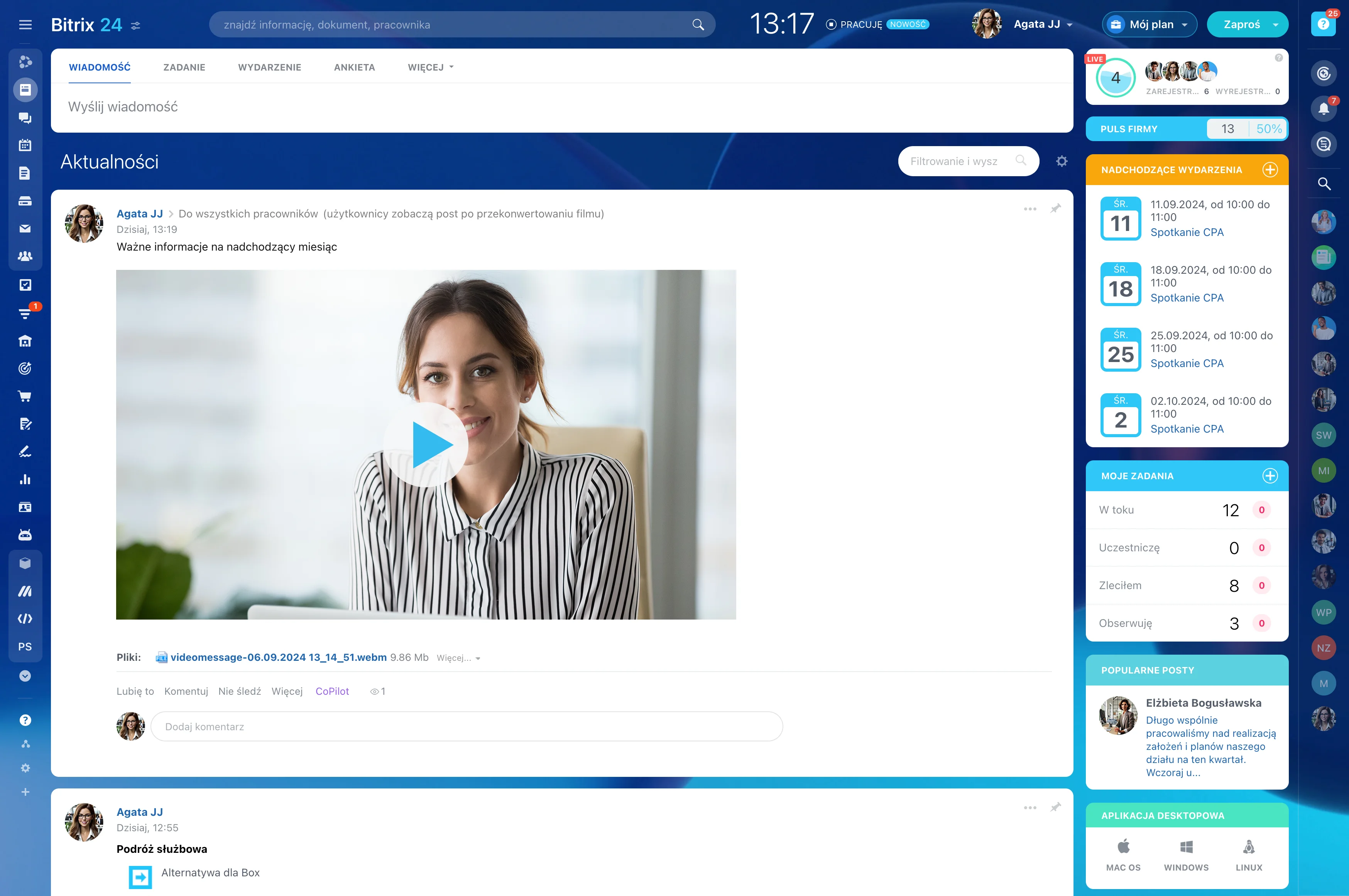 Kanał aktualności w Bitrix24 to miejsce, gdzie znajdziesz wiadomości dotyczące firmy i zespołu, obejrzysz ogłoszenia, wypełnisz ankiety, weźmiesz udział w dyskusjach w komentarzach lub udostępnisz własne informacje wybranym członkom zespołu albo całej firmie.