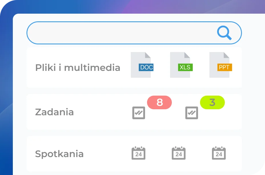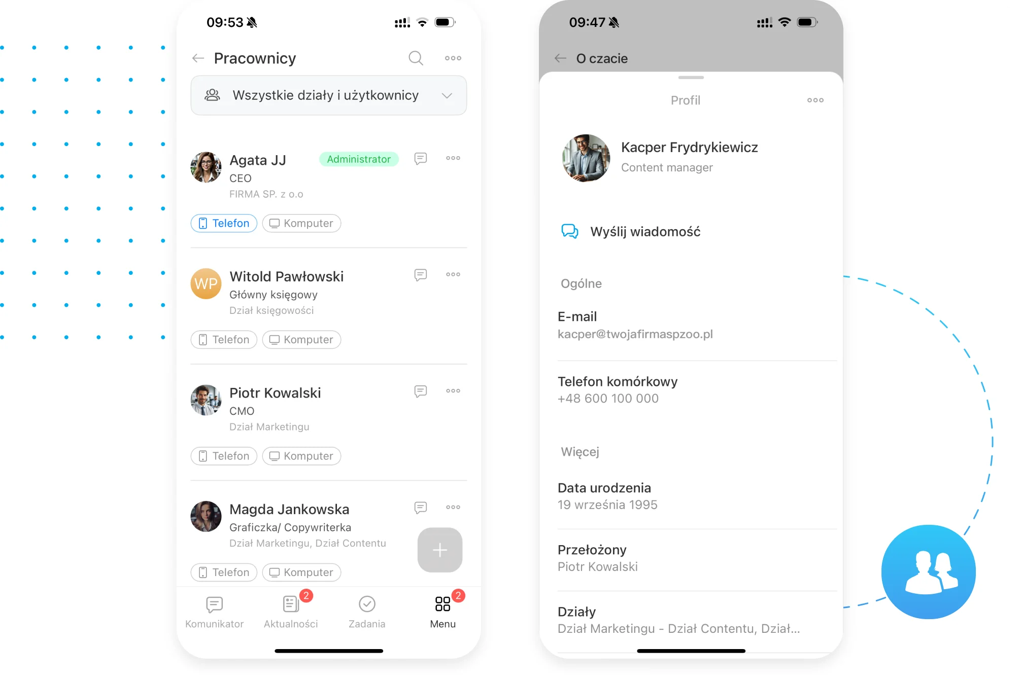 Centralny katalog pracowników z możliwością wyszukiwania, w którym można uzyskać szybki dostęp do danych pracownika w tym danych kontaktowych, zadań, kalendarza, grup roboczych, dysku i jego aktywności w aktualnościach.