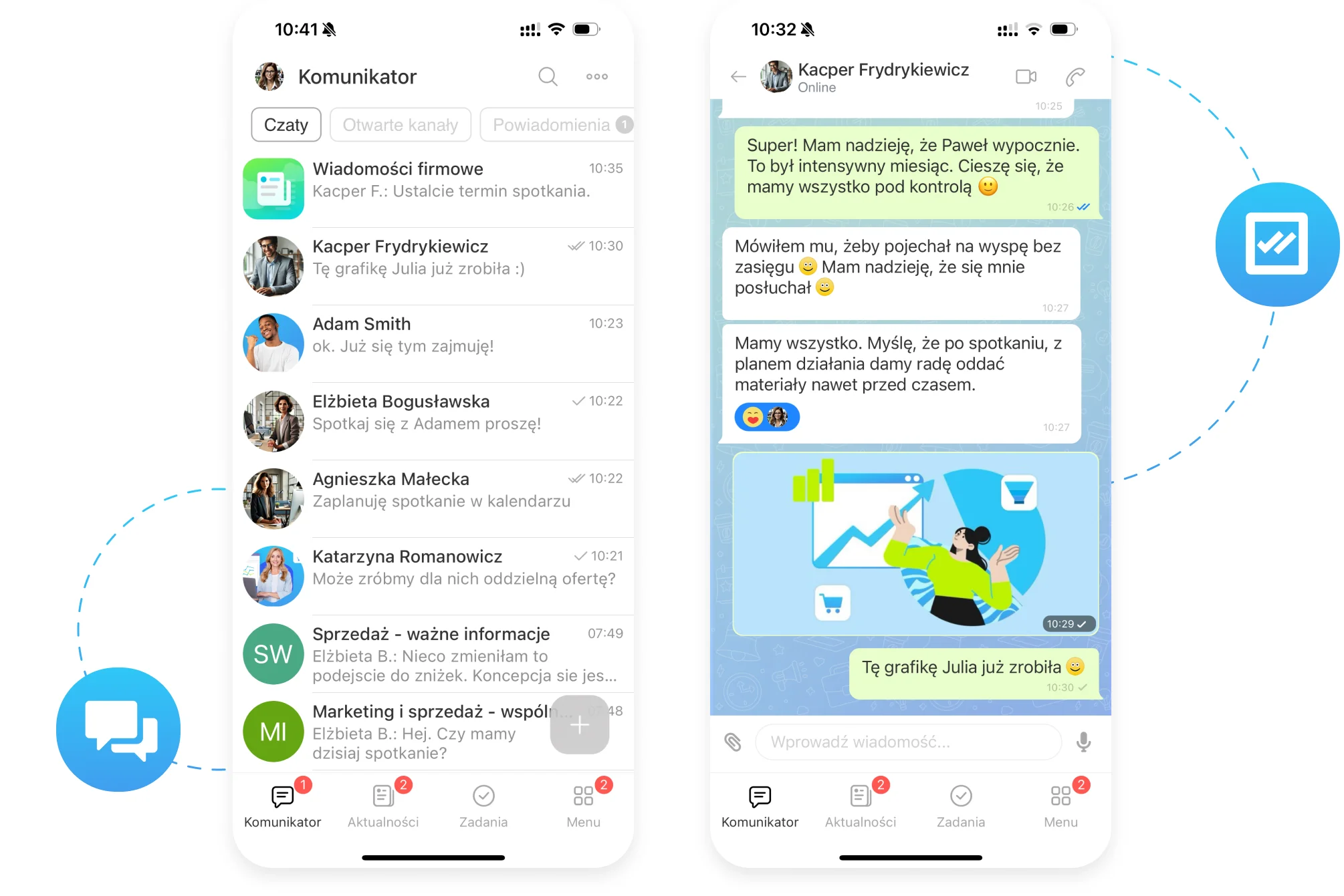 Komunikator Bitrix24 zapewnia szybką, produktywną i bezpieczną komunikację, która jest organicznie powiązana z resztą naszych narzędzi do współpracy i CRM.