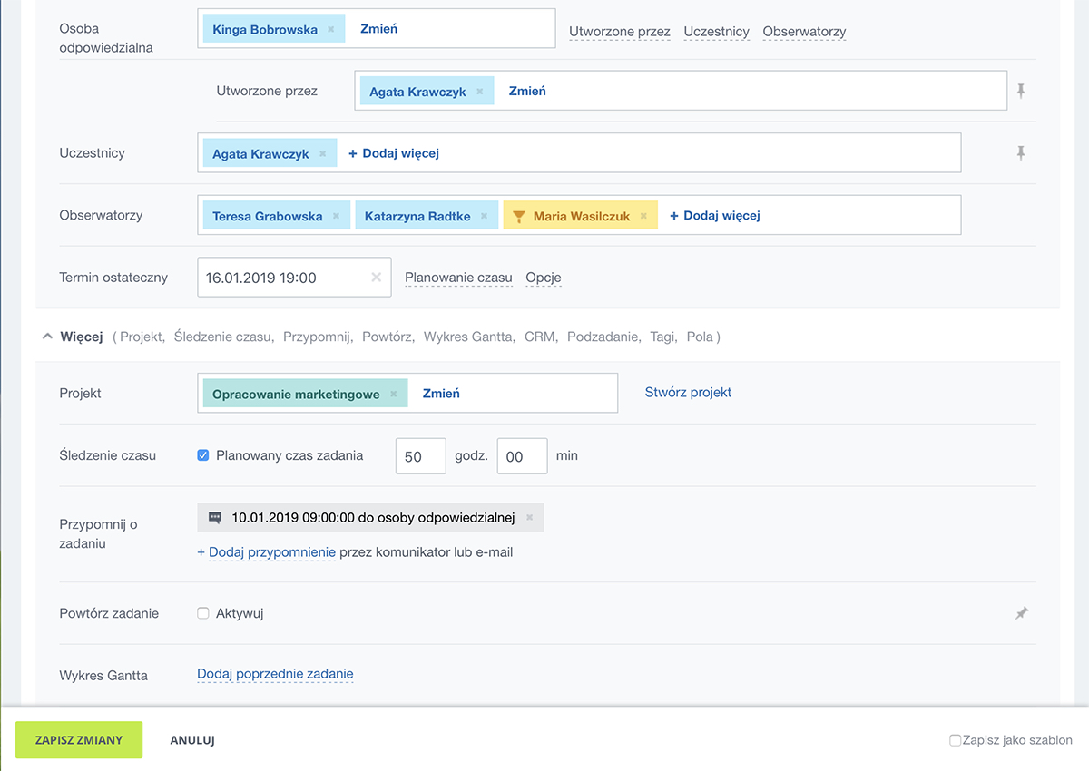 W Bitrix24 istnieją 4 role związane z zadaniami: osoba, która przypisała zadanie, osoba, której zadanie zostało przypisane (odpowiedzialny), współpracujący (uczestnicy) oraz osoby, które muszą być o wszystkim informowane (obserwatorzy).