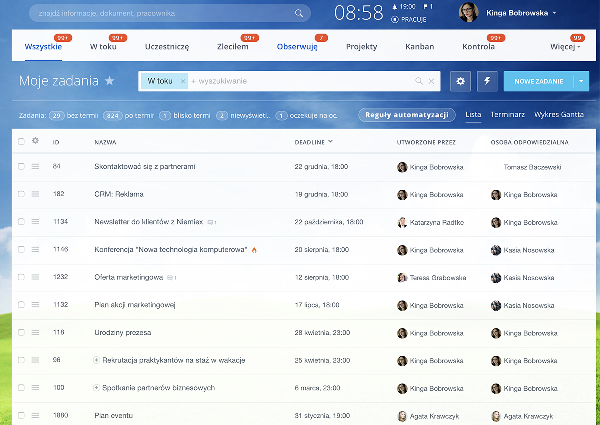 Zadania z ostatnią aktywnością są wyświetlane na górze listy, co ułatwia koncentrację na najważniejszych kwestiach. To praktyczne narzędzie do zarządzania pracą.