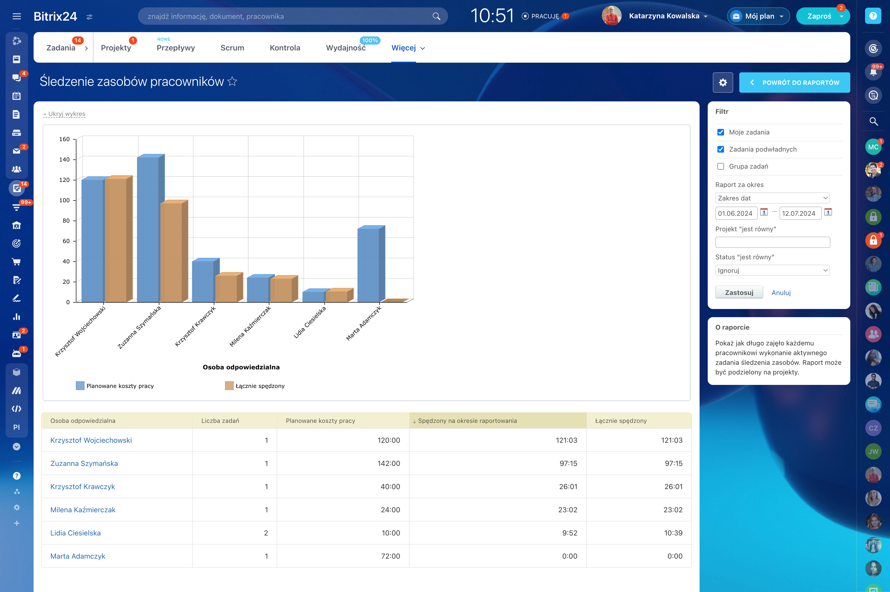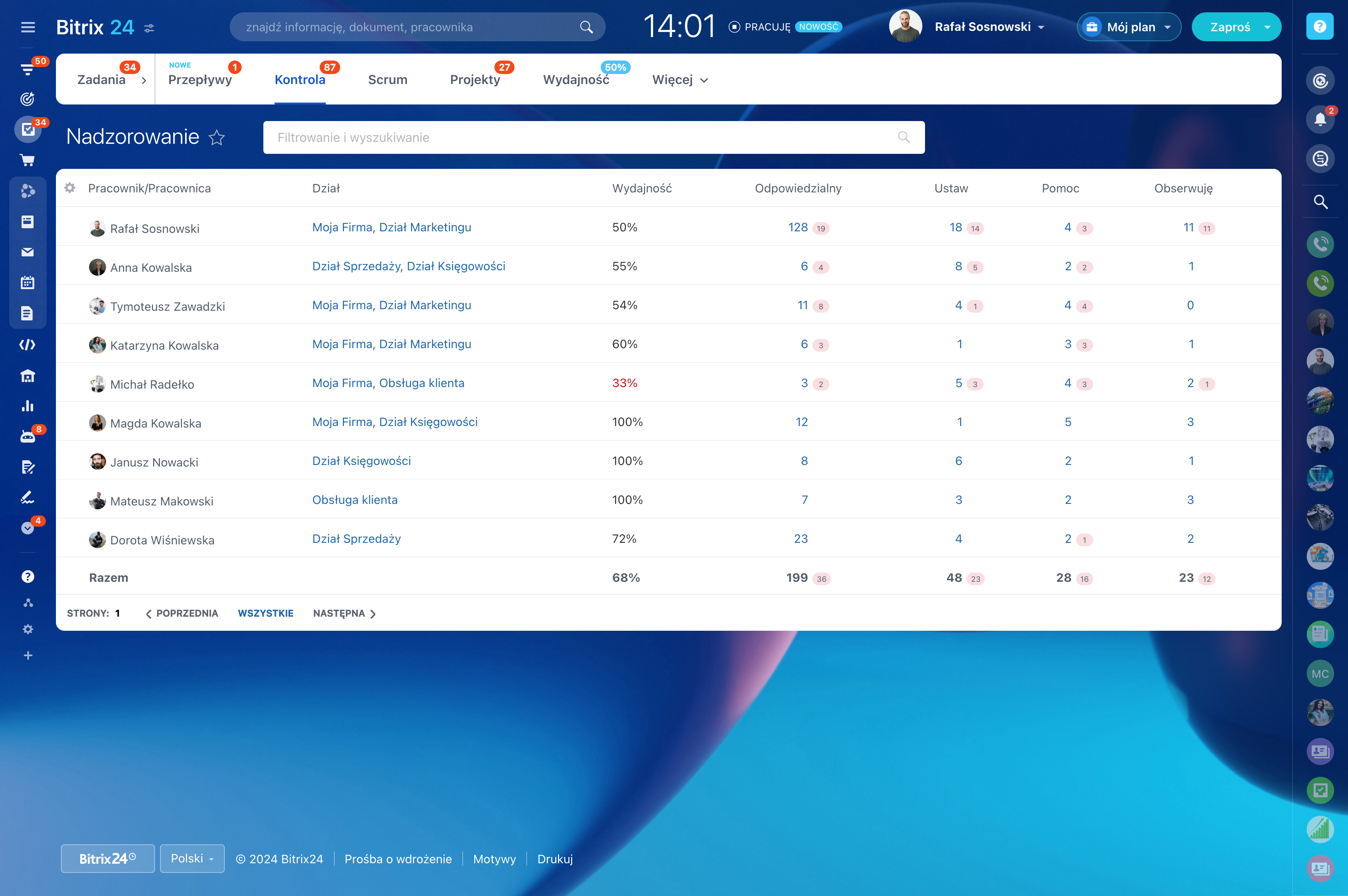 Wszystkie zadania przypisane do konkretnej osoby są automatycznie monitorowane, aby dowiedzieć się, ile z nich ukończono sprawnie i na czas. Wydajność w zakresie zadań możesz sprawdzić dla poszczególnych pracowników i działów.